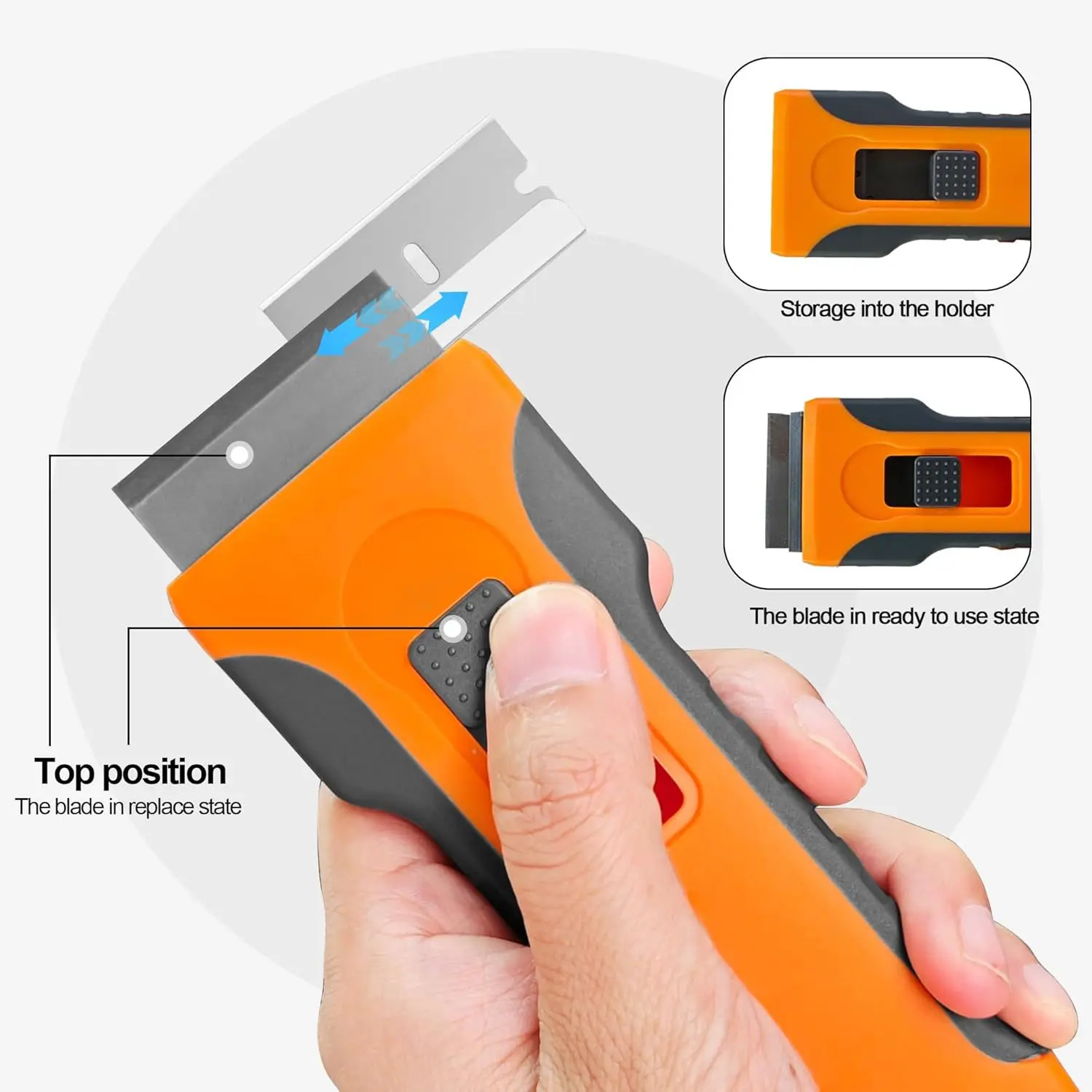 SAFETY & PORTABLE: The razor blade shaving tool features double safety protection.The blades are secured by knobs, providing a solid structure for the scraper.This upgraded design solves the hassle of retracting or pushing out the retractable razor blade when in use, and the double-ended plastic razor blade comes with a safety protection cover, which is convenient for storage and reduces the risk of cuts.