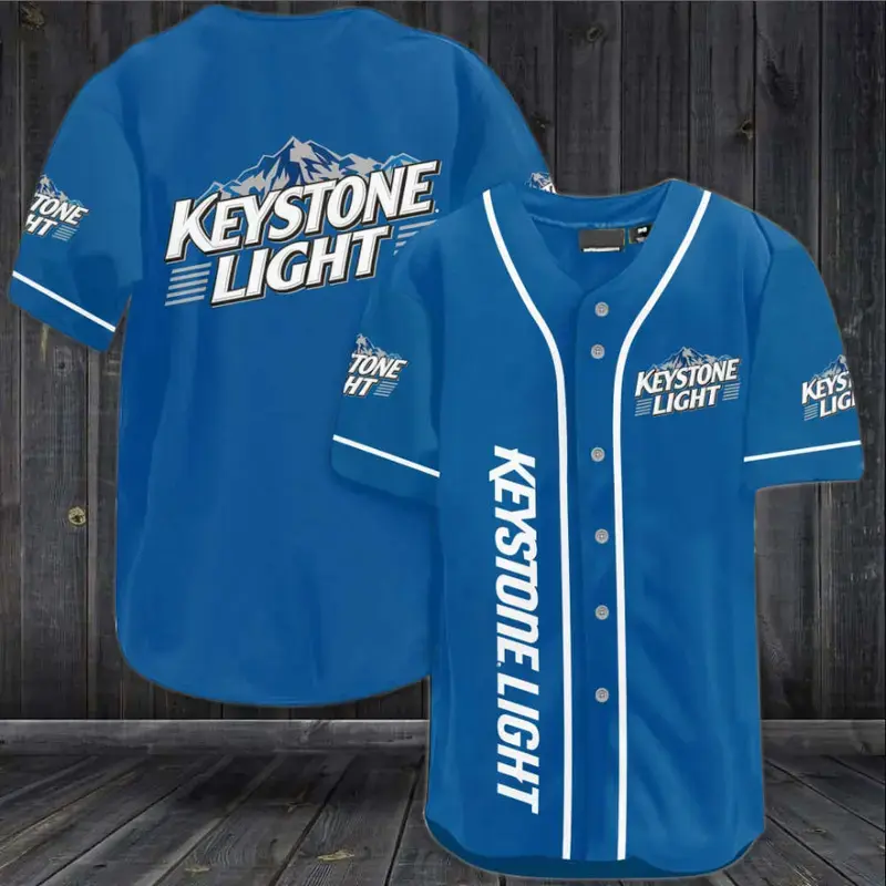 5. Keystone Light Beer Baseball Jersey – Keystone Light All Over Print Button Down Baseball Shirt, Keystone Light Beer Brand Blue Jersey, Unisex Streetwear Baseball Jersey for Men Women, Beer Lover Gift