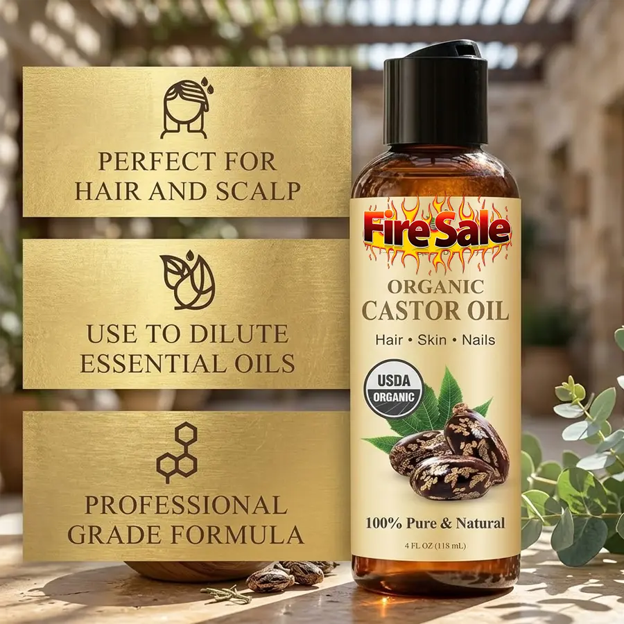Our USDA organic castor oil is a premium-grade carrier oil, perfect for essential oils, hair care, skincare, and aromatherapy. Expeller-pressed and hexane-free, it's ideal for various uses. This 4 fl oz bottle is a versatile addition to your beauty routine.