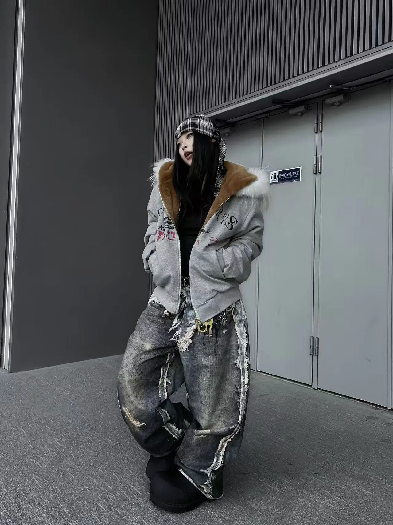 Distressed Fold Over Low Rise Wide Leg Jeans