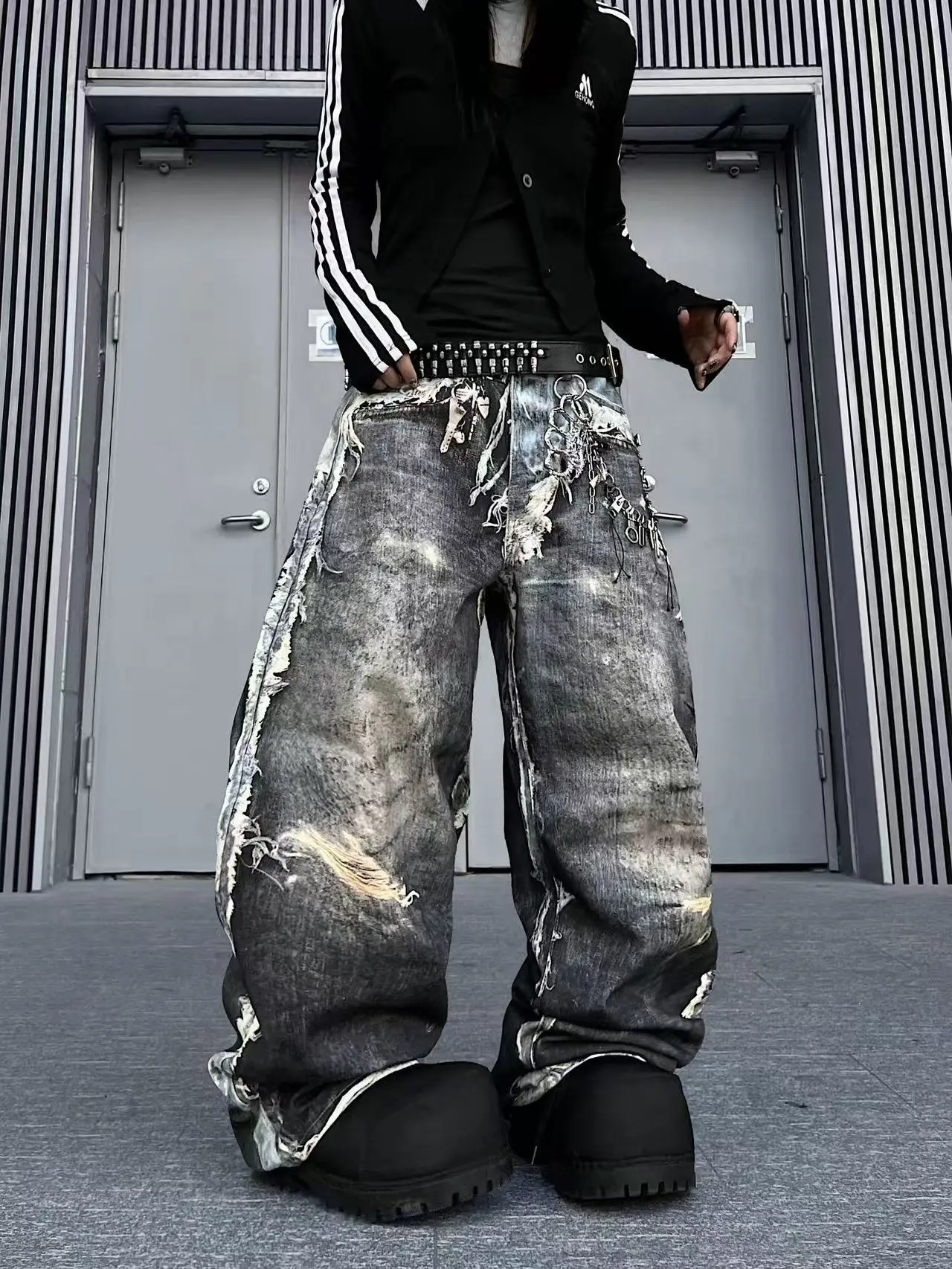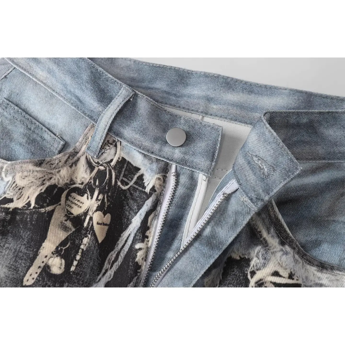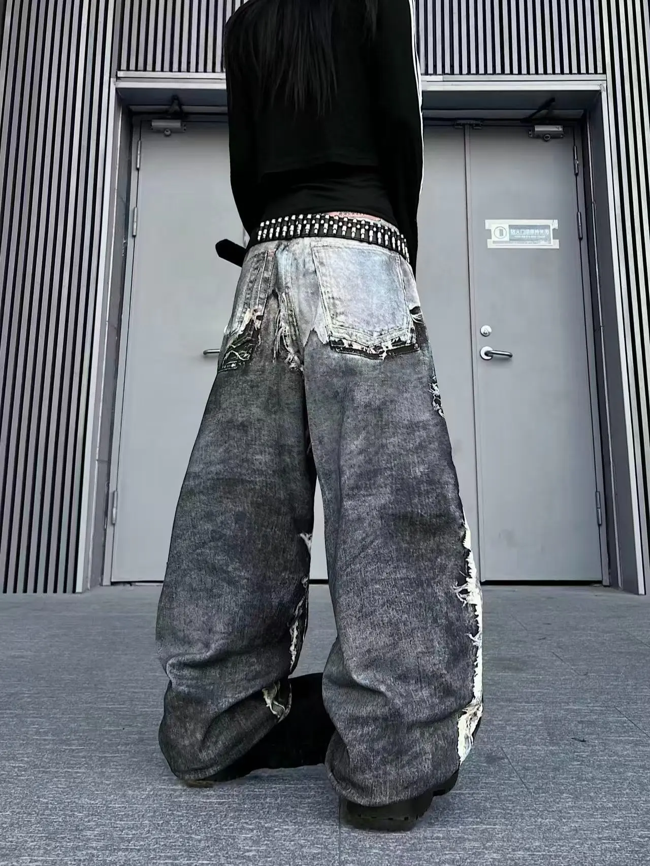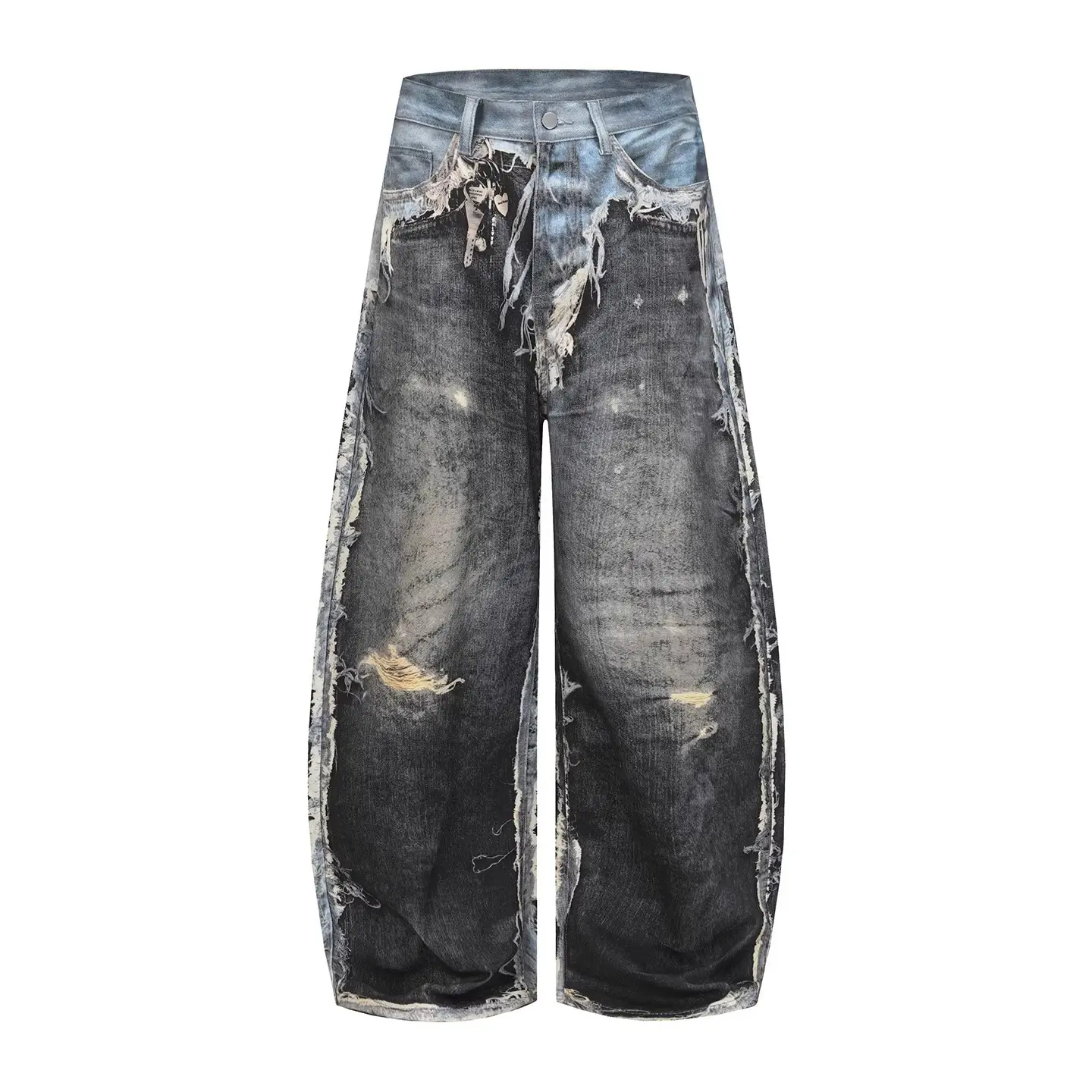 American Distressed 3D Digital Print Fake Two-Piece Jeans - Baggy Streetwear Loose Wide-Leg Pants