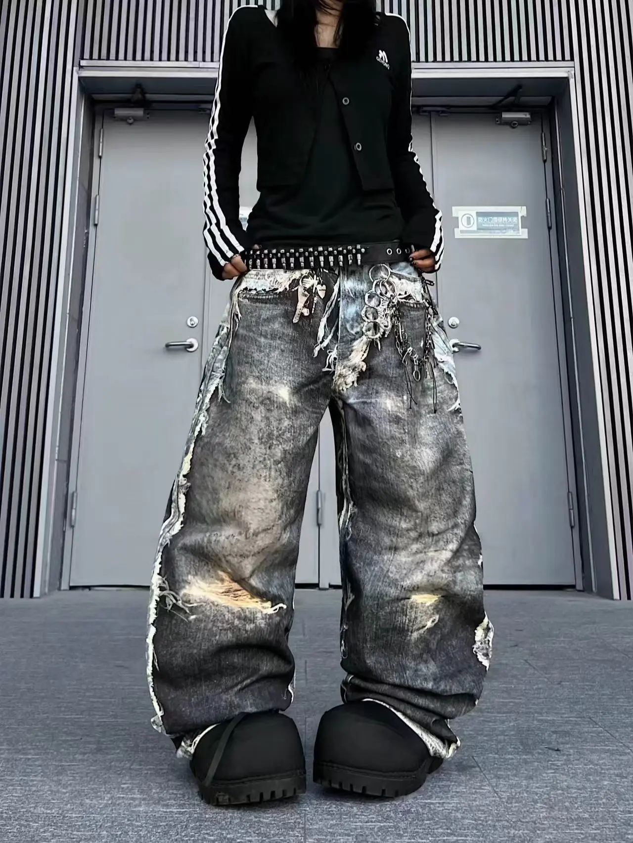 Women's Rock Punk Ripped Jeans, Spring New High-Waist Wide-Leg Pants, Loose Embroidered Floor-Length Denim, Drapey Casual Bottoms