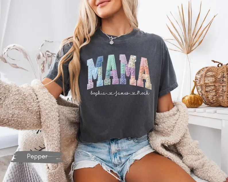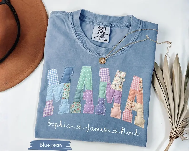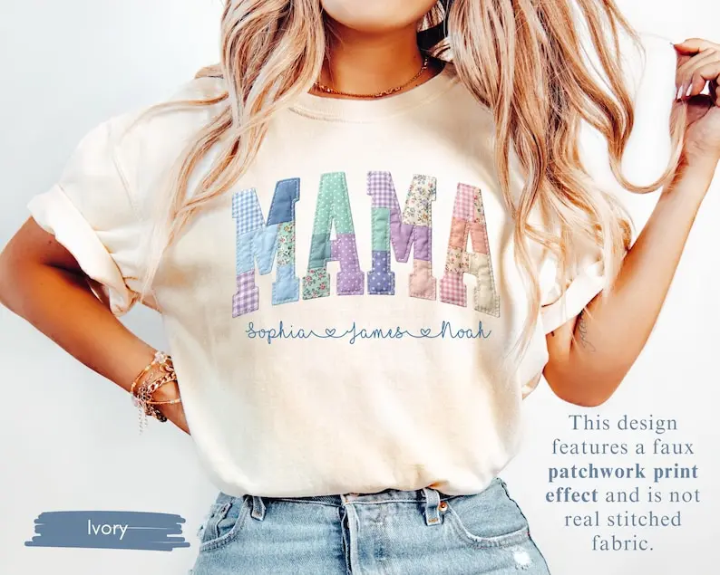 5. Personalized Mama Faux Patchwork Shirt With Kids Names, Floral Mom Shirt Personalized, Mothers Day Gift Shirt For Mama, Gift For Mom Shirt ( Please leave a note or message us your name before ordering.)