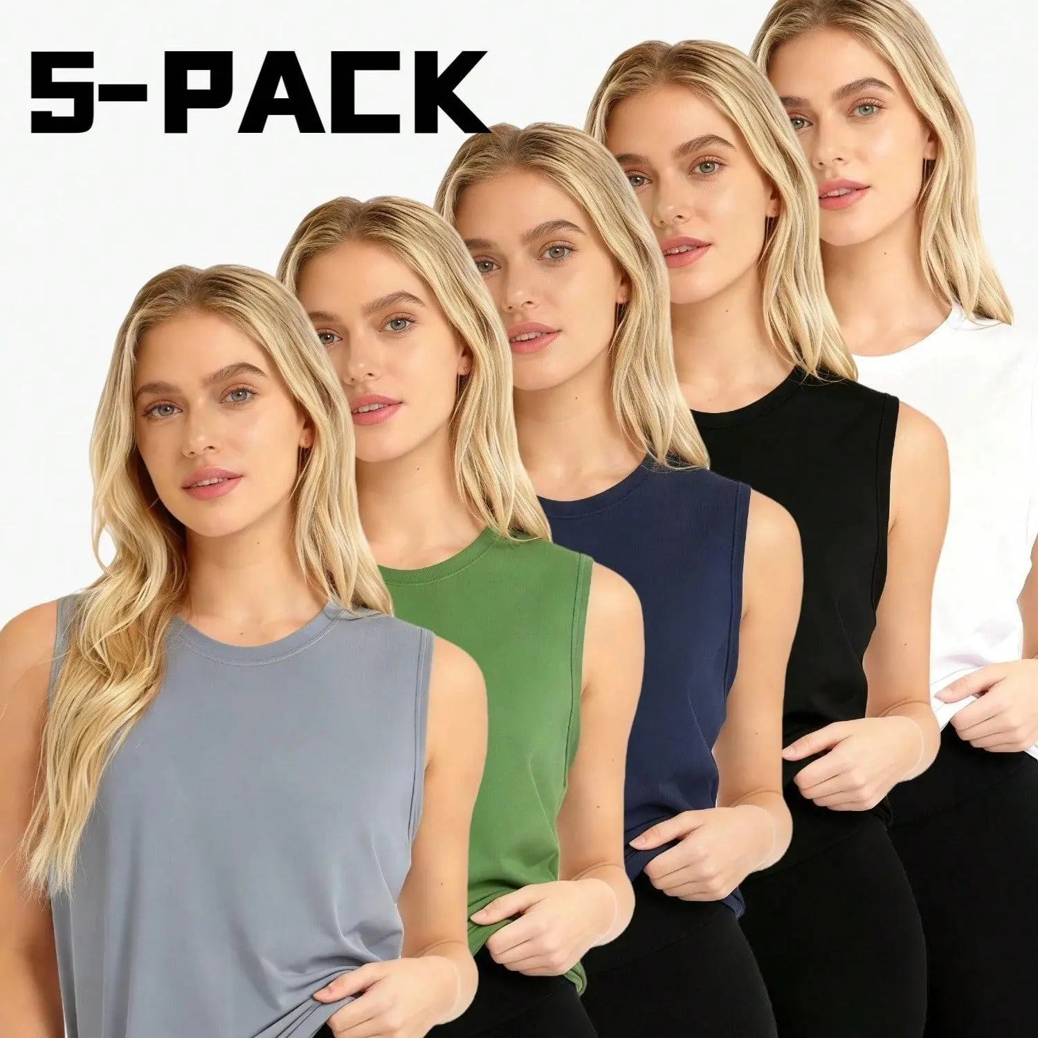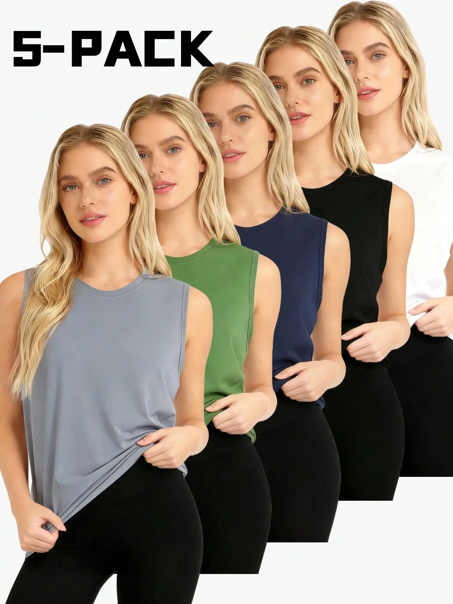 OKP 5 Pack Plus Size Women's Sleeveless Sports Vest, Loose Fit Breathable Workout Tank Tops, Moisture Wicking Yoga Tops, Casual Daily Layering Tanks For Gym, Running,Lounging