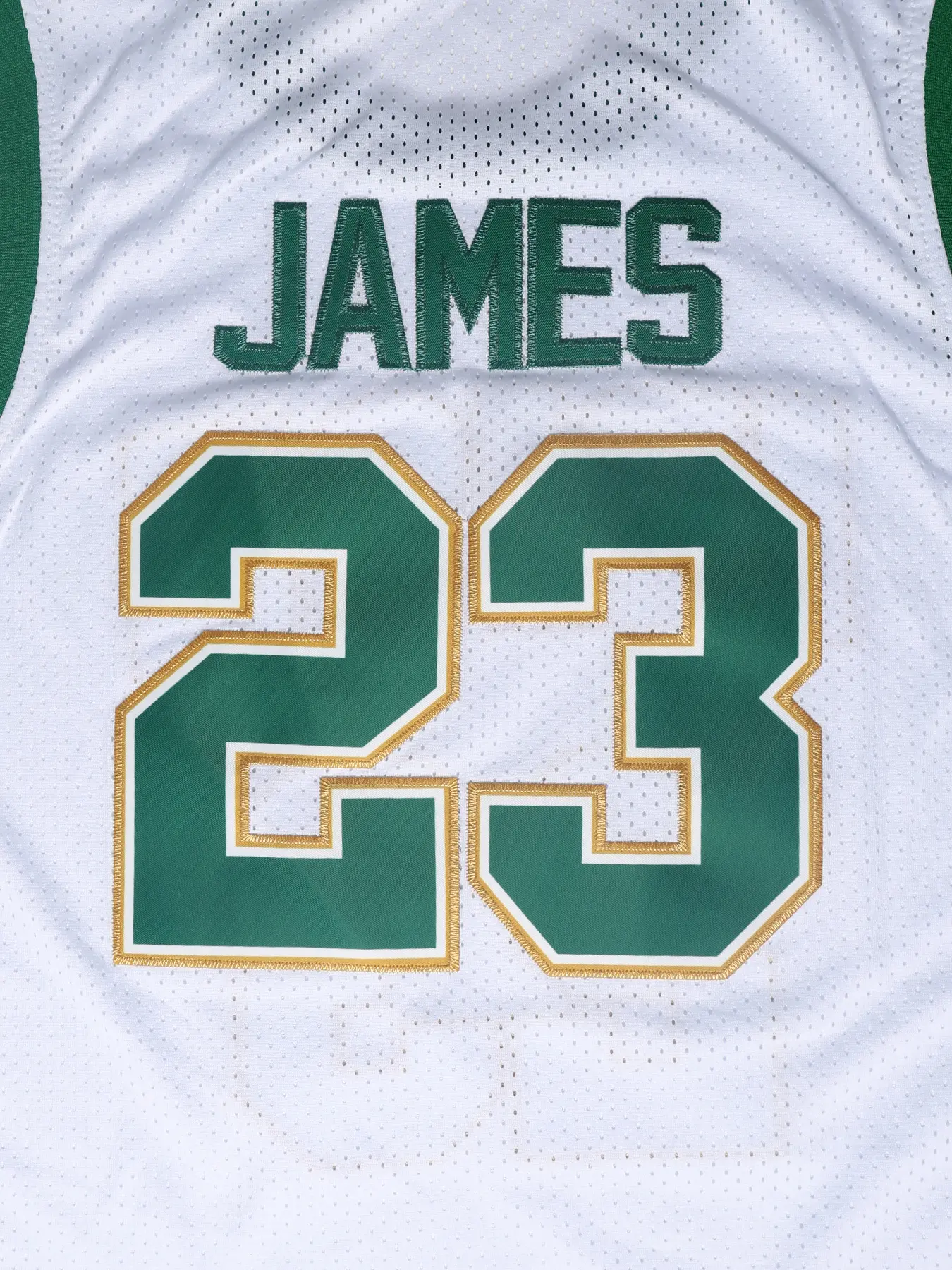 Celebrate the legendary career of #23 James with this iconic vintage high school basketball jersey, a timeless tribute to iconic hoops style. Crafted from premium 100% polyester perforated mesh fabric, this jersey delivers exceptional breathability, quick-drying performance, and moisture-wicking technology to keep you cool and dry.