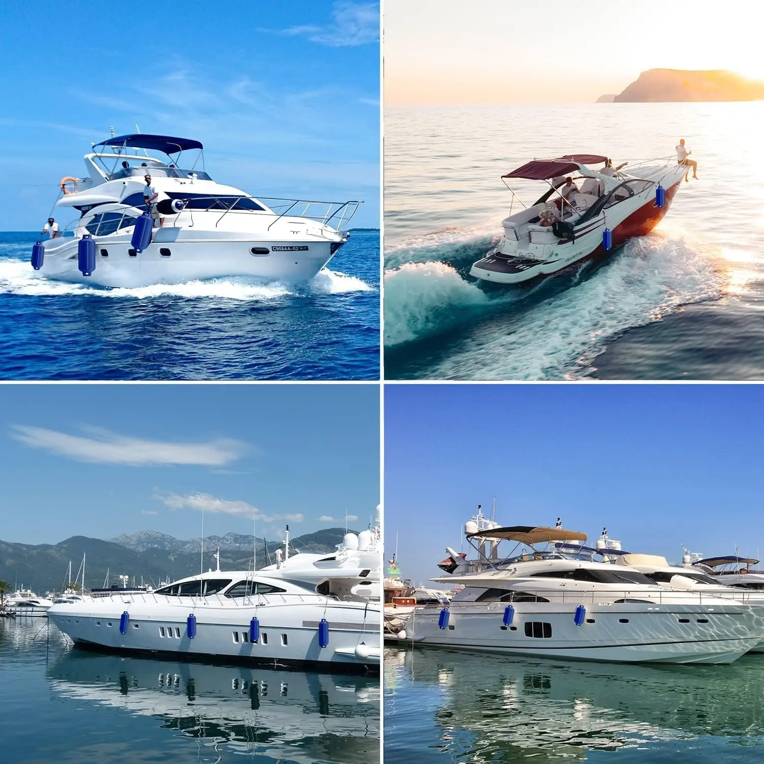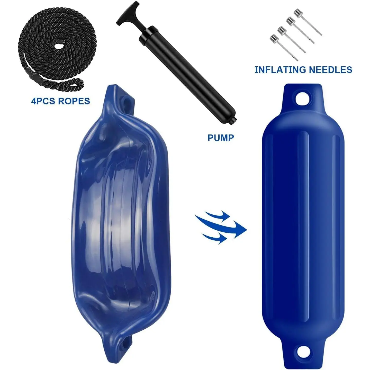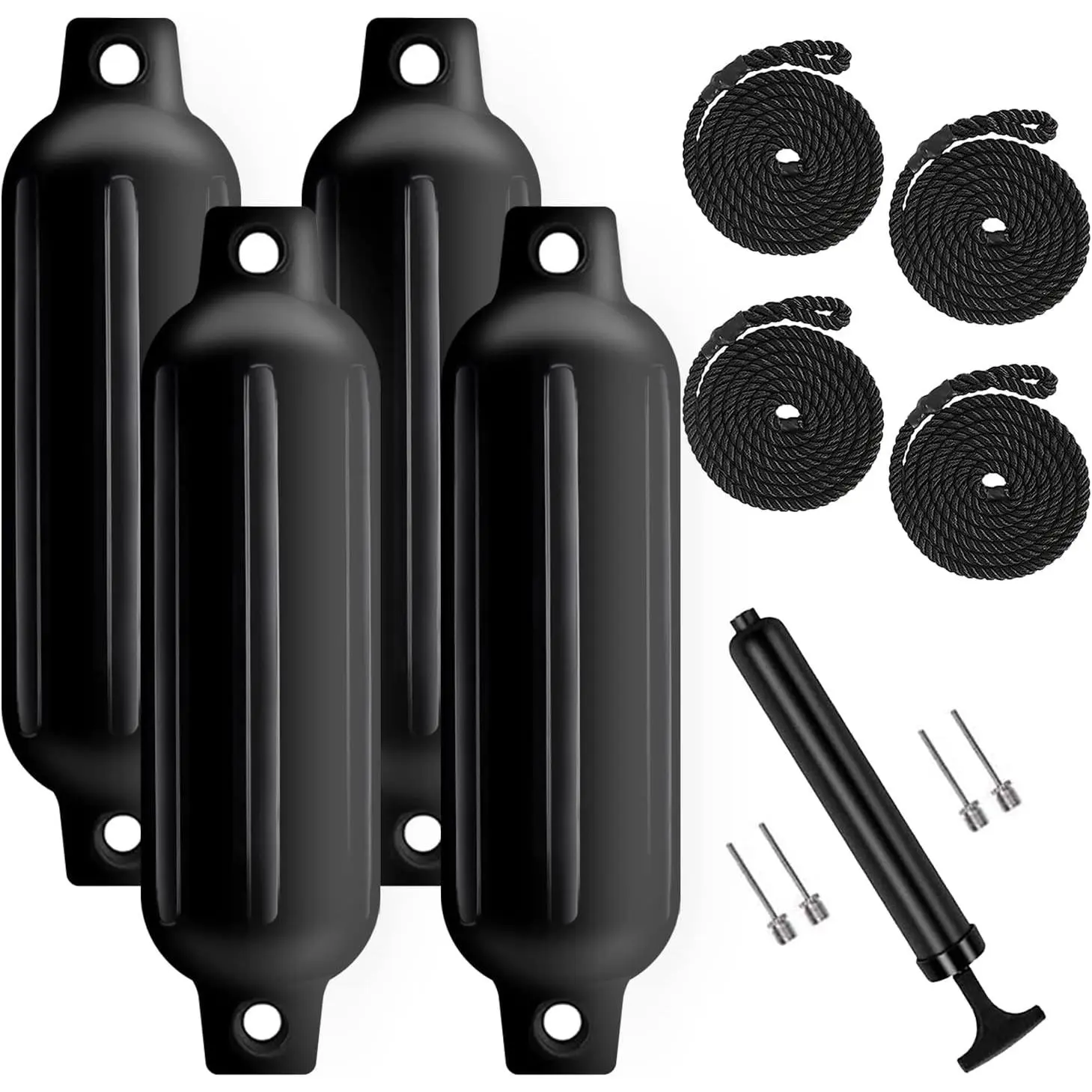 Comes with 4 Pack Boat Fenders , 4 Fender Lines (6.5ft in length), 4 inflating needles and 1 hand pump; Our boating accessories offer good quality and reliability while on the water.