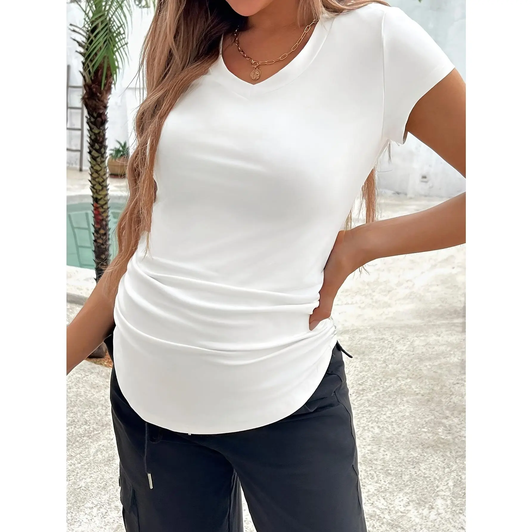 This white T-shirt is a must-have for maternity wear. It's easy to match with different bottoms, from jeans to leggings. The top's design accommodates your growing belly, ensuring comfort. Stay fashionable and comfortable throughout your pregnancy.