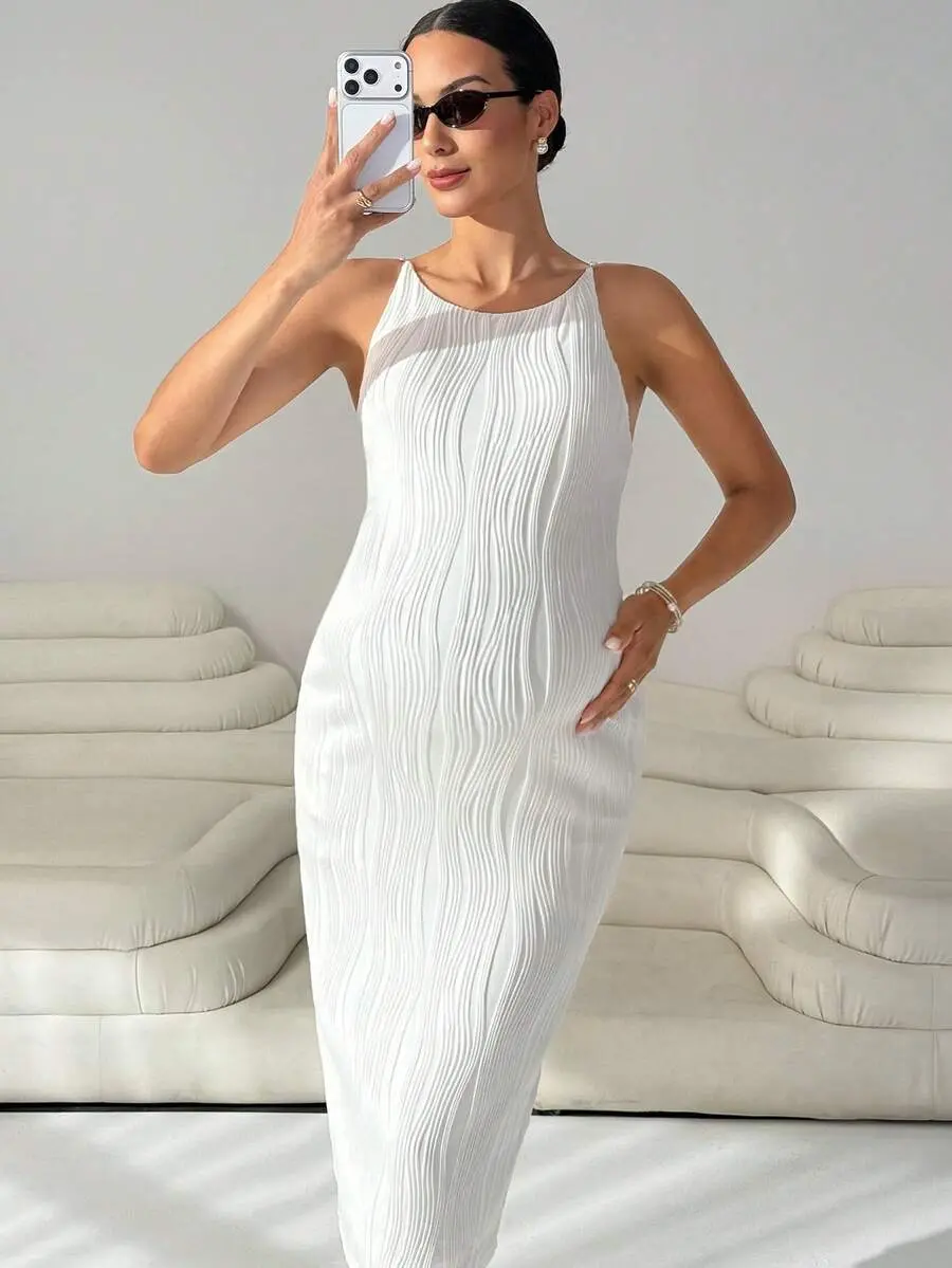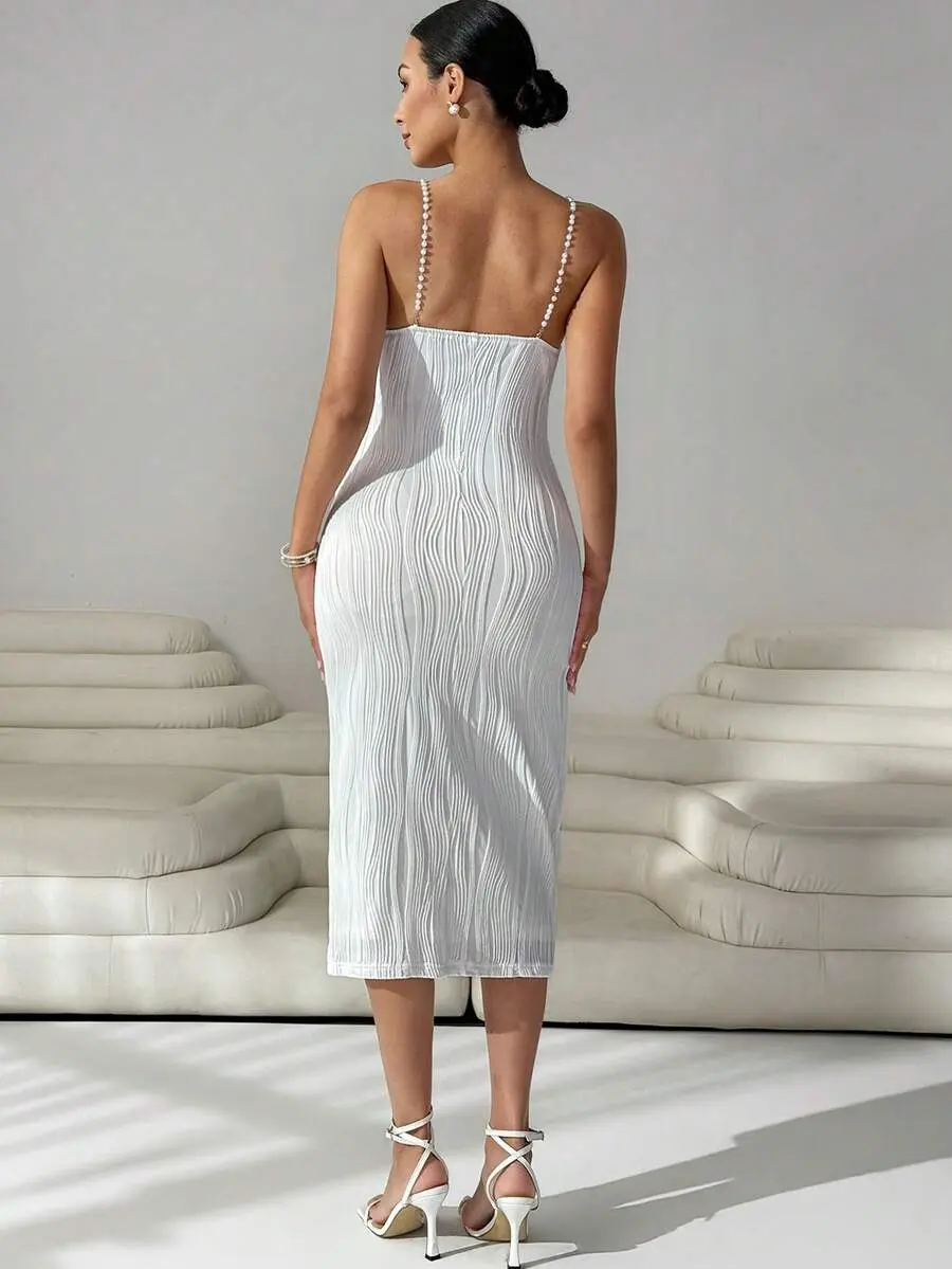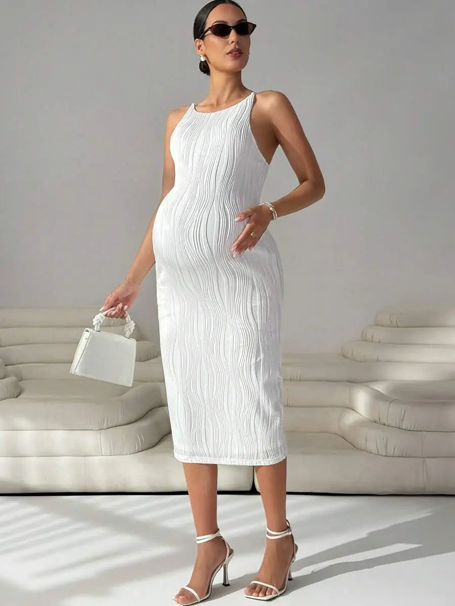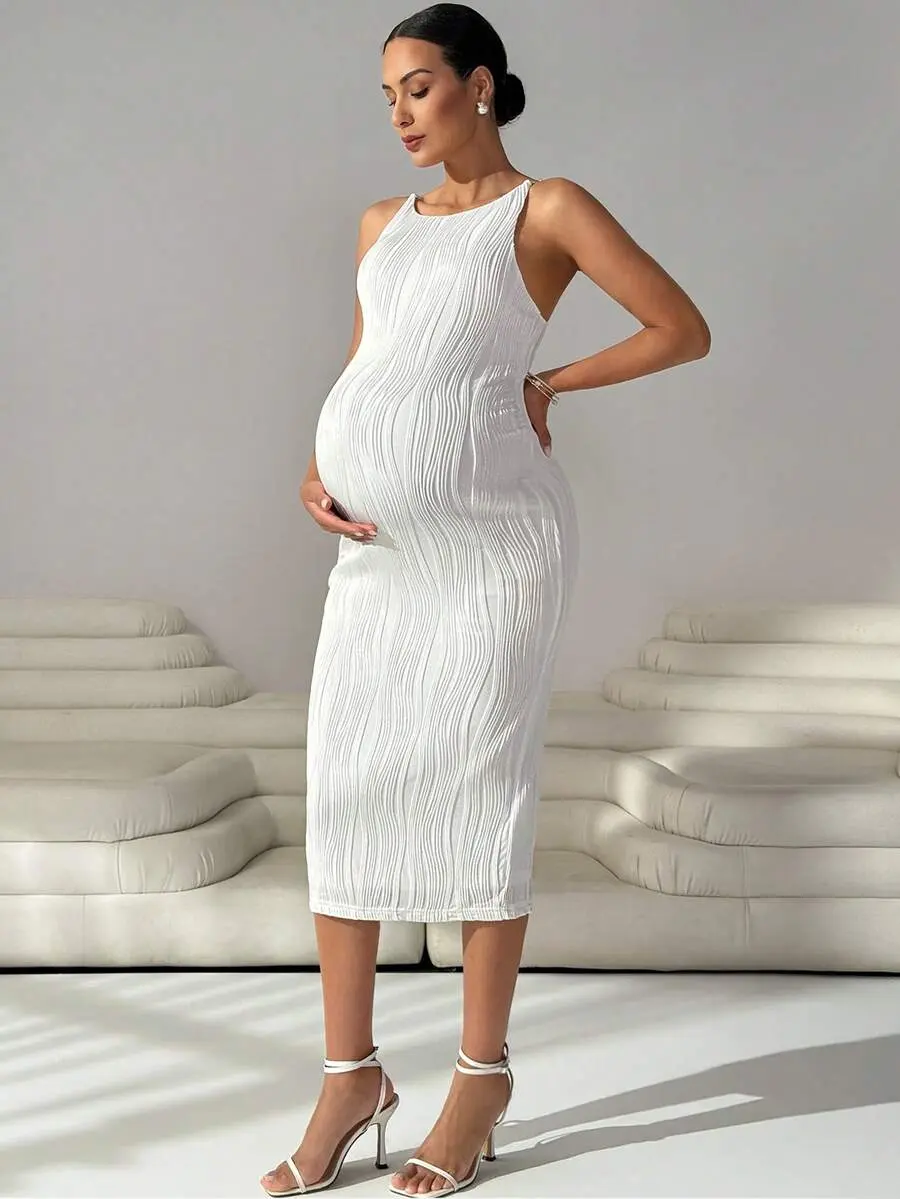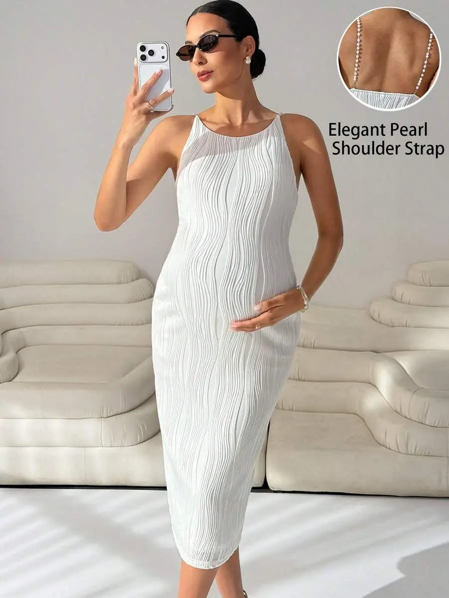 ELLIOTTWII Summer Outfit Maternity Work Clothes Maternity Work Outfits Maternity Work Dresses White Jacquard High-Elasticity Slim-Fit Maternity Dress With Pearl Shoulder Straps Maternity Solid Color Round Neck Fitted Elegant Sleeveless Dress