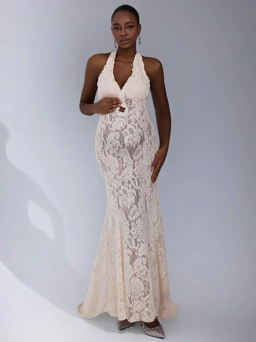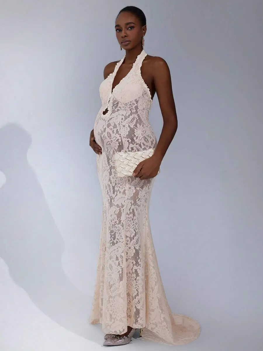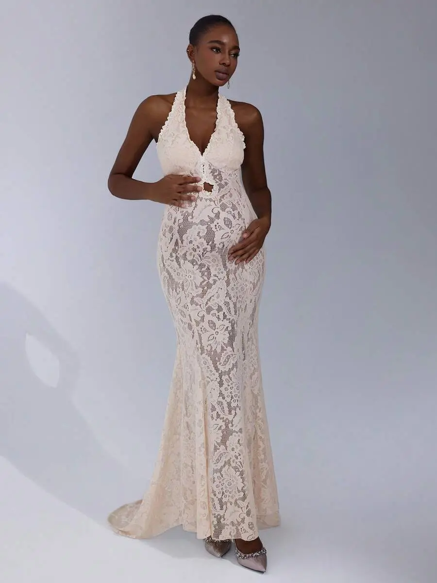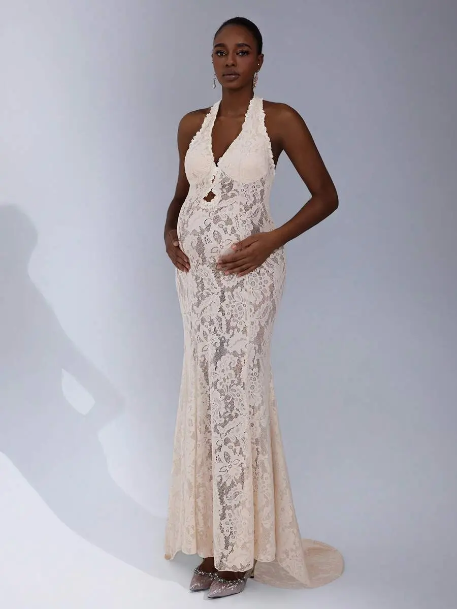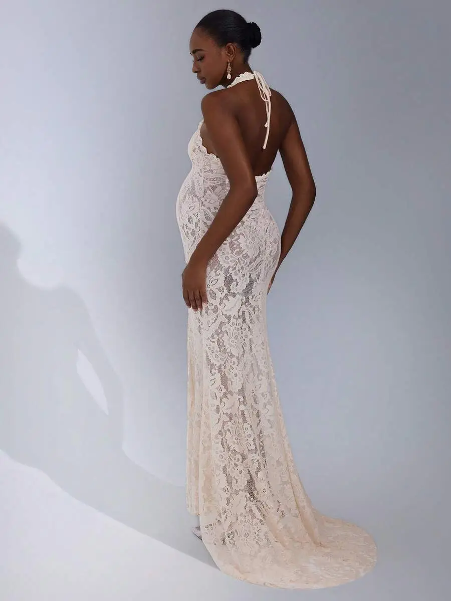 ELLIOTTWII Maternity Photography Dress, Halter Neck With Backless Bowknot Lace Mermaid Maxi Dress