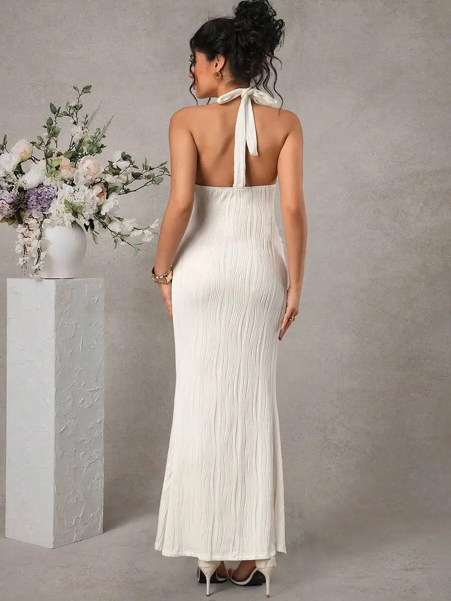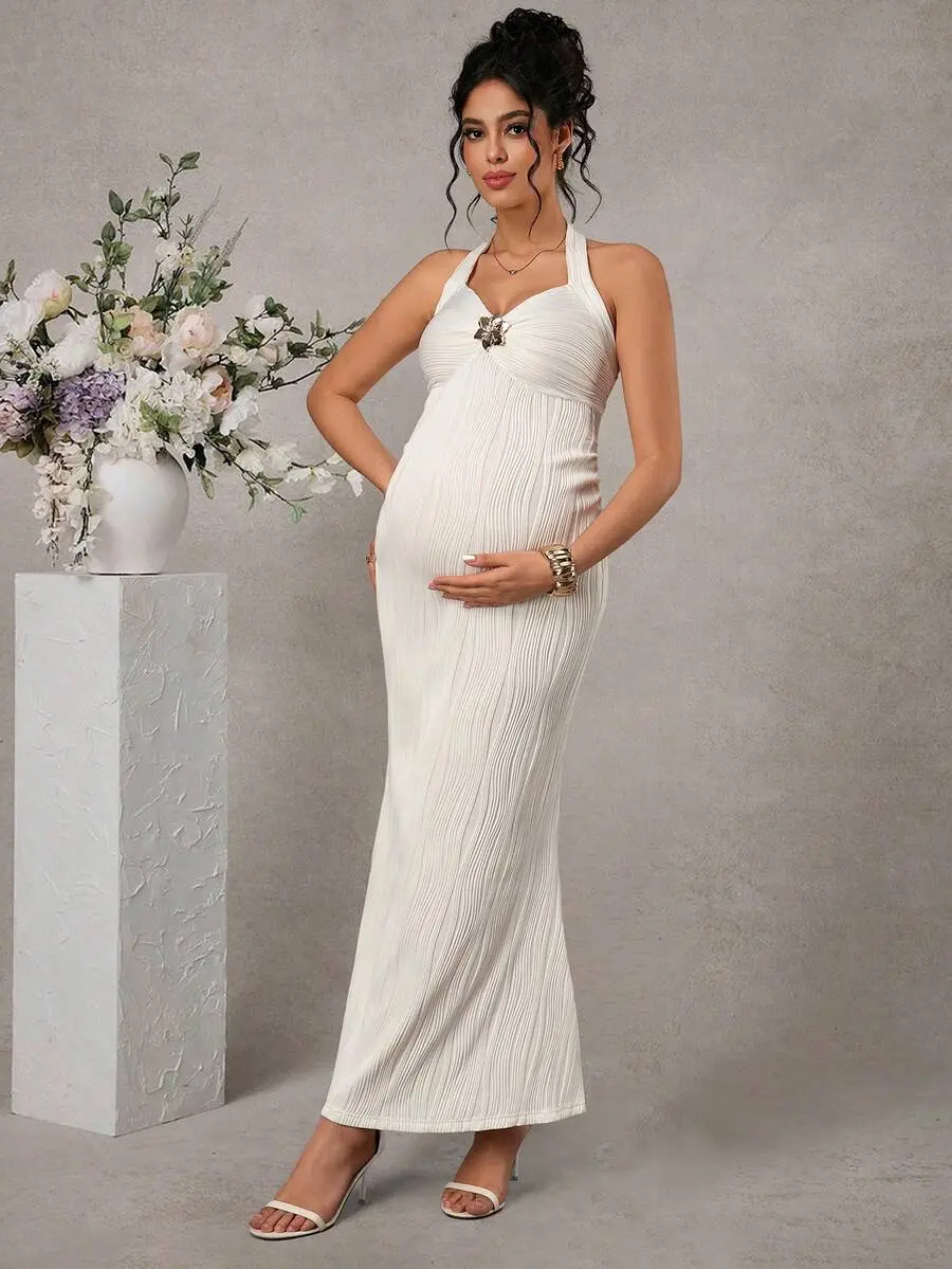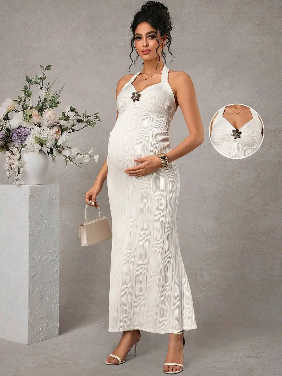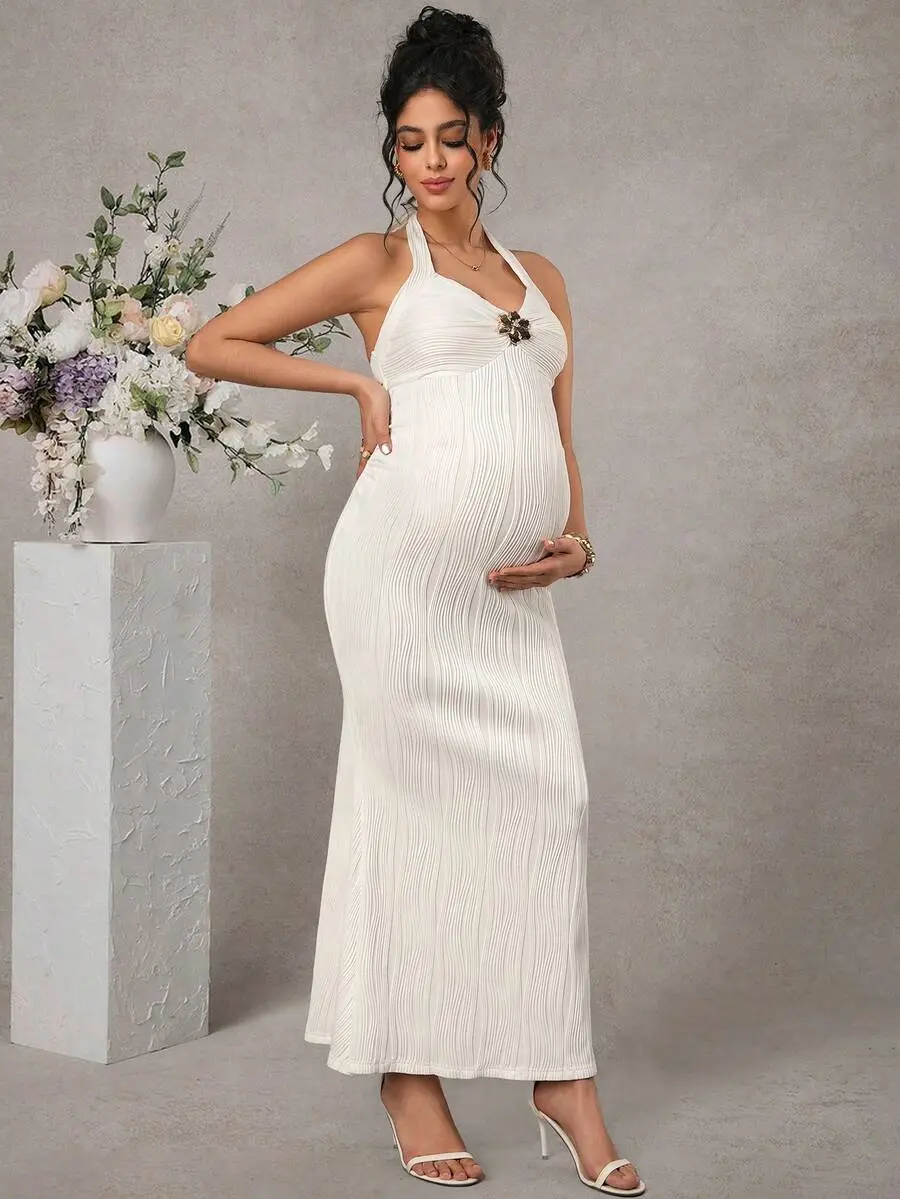 ELLIOTTWII Maternity Solid Color Plunging Neckline Backless Sleeveless Fashionable Dress Summer Outfits Maternity White Dress Bump Friendly Dress Pregnancy Dress For Photoshoot Wedding Guest Dress Elegant Dresses