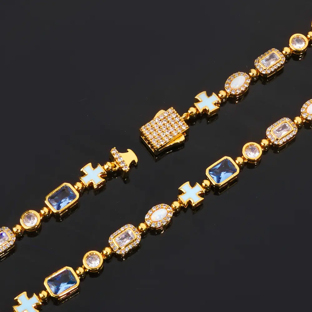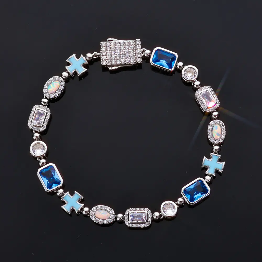 Designed with a strong hip hop aesthetic, this bracelet features a unique mix of colorful gemstones and cross motifs, making it a standout piece for street fashion lovers.