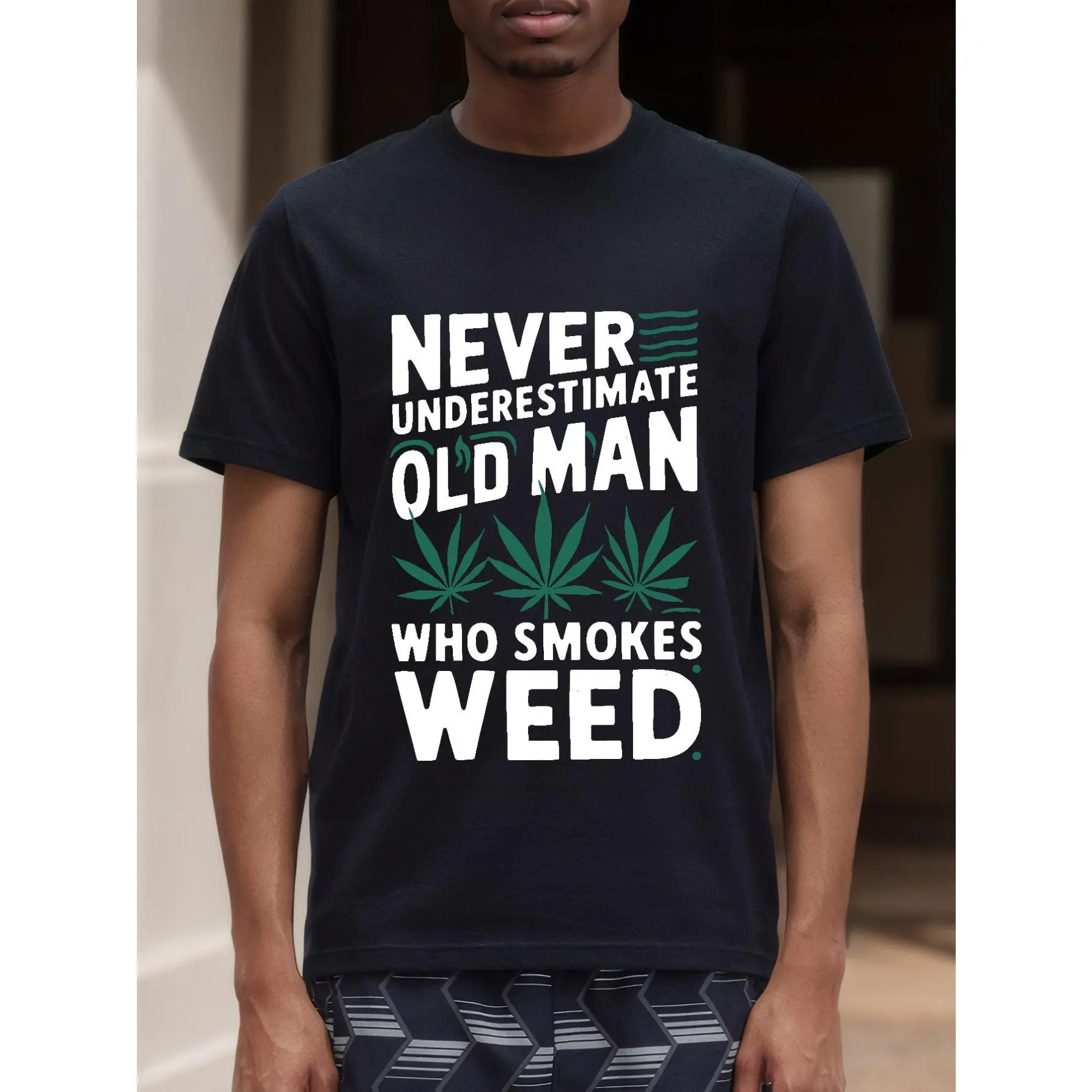 Men'S Fun Culture T-Shirt - "Never Underestimate The Power of An Old Who Smokes" Slogan with Leaf Print, Round Neck T-Shirt, Regular Fit Short Sleeve Shirt, Suitable for Smokers, Casual and Everyday Wear