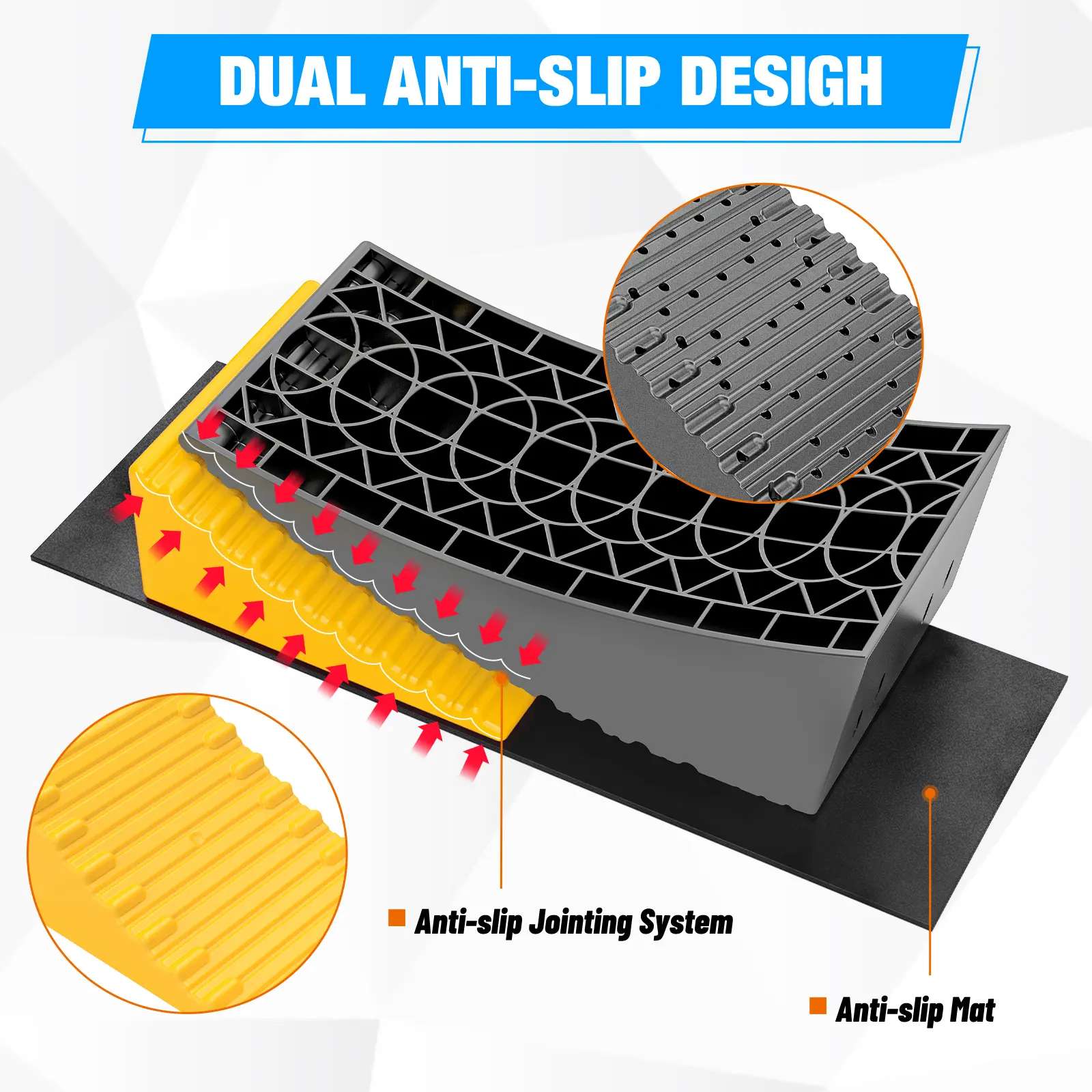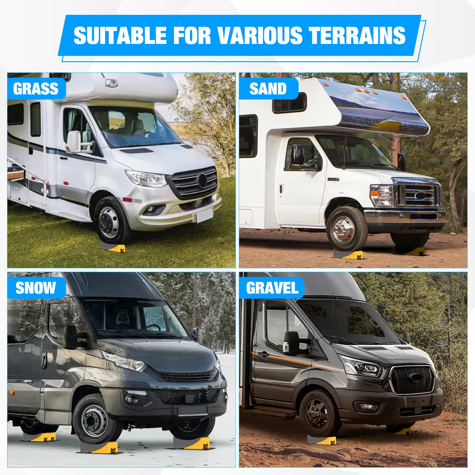 ·Non-slip design: Featuring a non-slip surface on the leveler and chock notches to prevent sliding while the RV is leveled. The wear-resistant rubber mats also offer excellent non-slip capabilities. The RV leveling system ensuring smooth and safe camper leveling