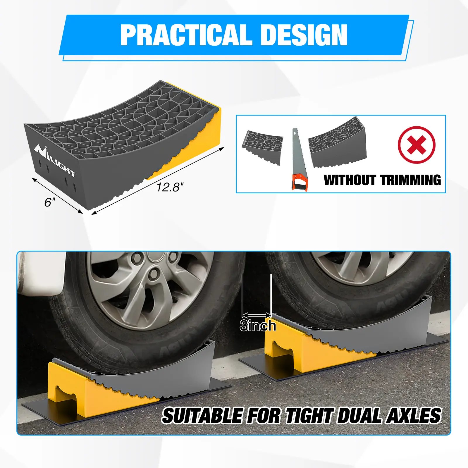 ·No Trimming for Dual Axle Trailer: Nilight rv leveling ramps are design to work seamlessly with dual axle trailer without any trimming. The suitable size makes leveling your camper easier and faster than other levelers that may require cutting to fit lengths