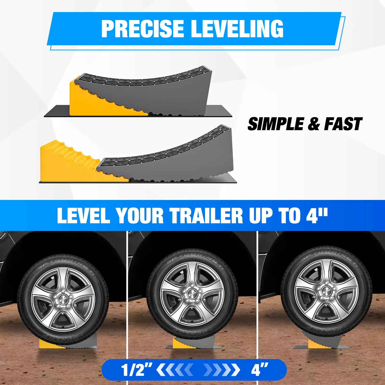·Make Leveling Fast: No more guesswork of determining the number of leveling blocks needed with our RV leveling blocks. Simple level your trailer any increment between 1/2" and 4" and quick level in minutes. Used for tires no bigger than 32" diameter