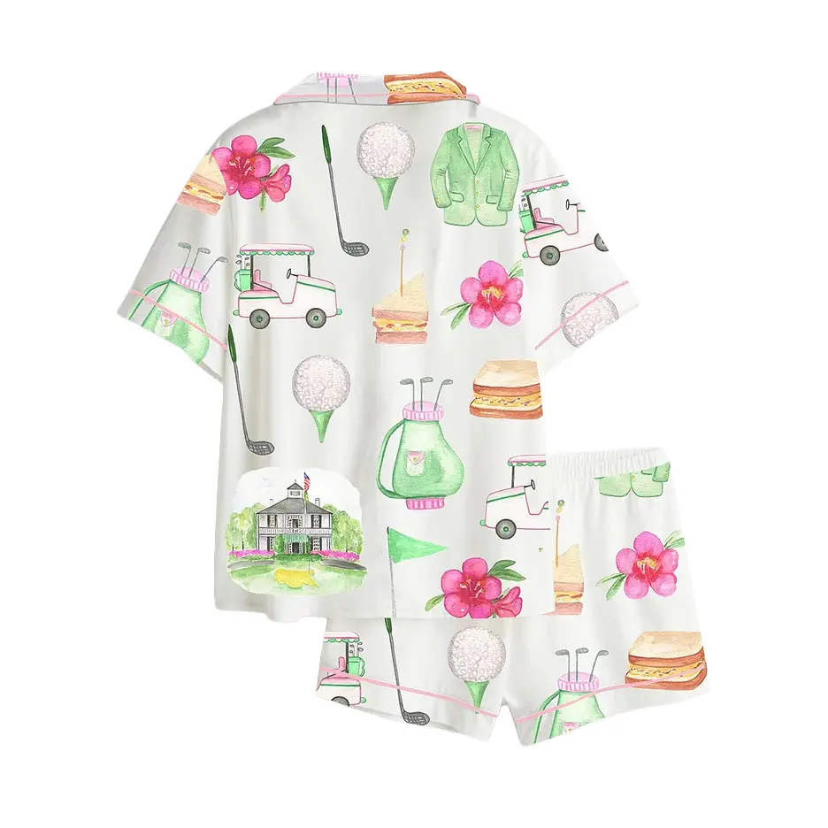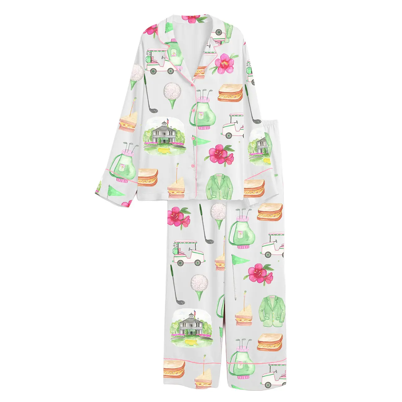 Women’s Golf Masters Augusta Watercolor Golf Print Long & Short Sleeve Satin Pajama Set, Gift for Her, Funny Lounge Outfit Gift, Loungewear Long & Short Set, Soft Sleeper Wearing
