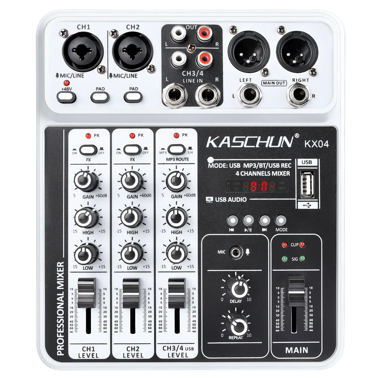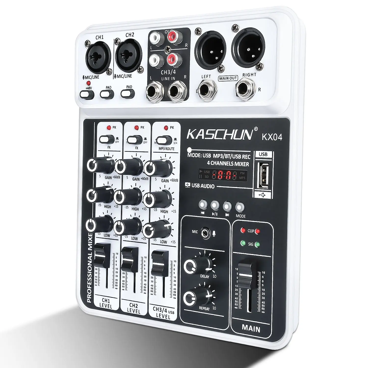 The Kaschun Audio M4 is a 4-channel audio mixer for content creators, streamers, and musicians. It features a high-performance sound card, clear preamps, and 48V phantom power. Bluetooth 5.0 ensures stable wireless connections. Ideal for vocals, instruments, and live broadcasts, it delivers clear, low-noise sound. Compact and durable, it's perfect for TikTok live streaming, podcasting, and small stage performances.