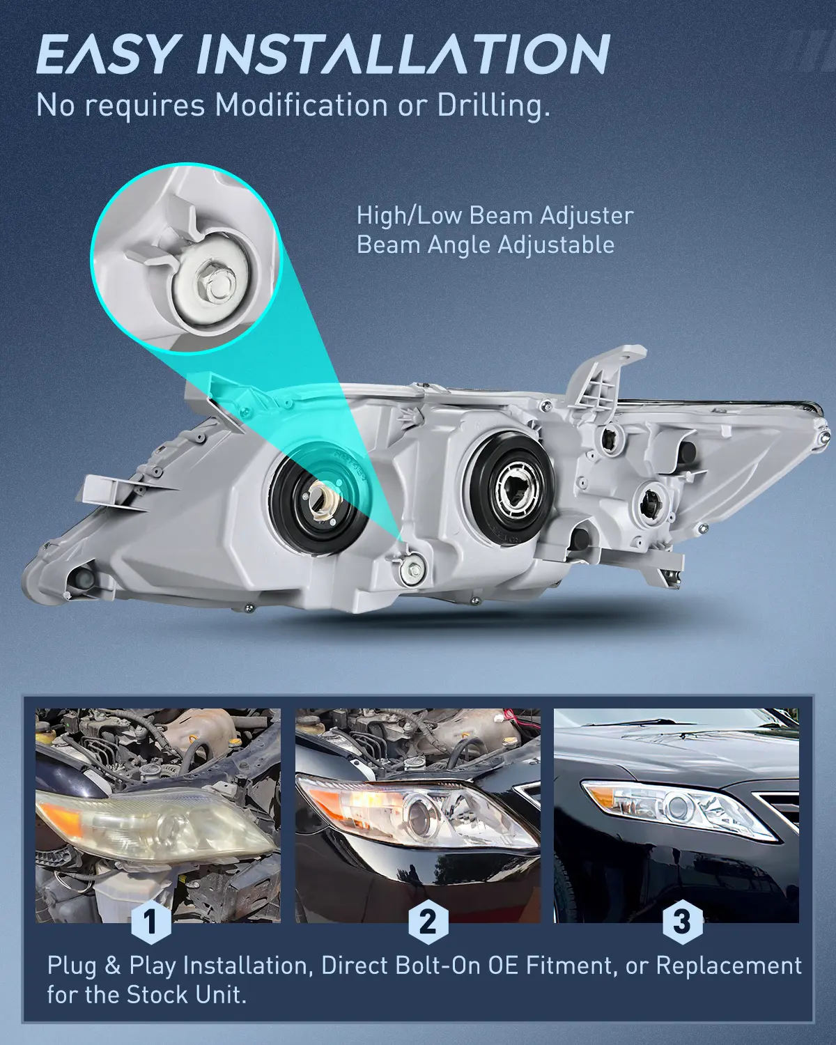 ·DOT Compliance and safe Driving: To ensure driving safety for you and the oncoming driving circumstance, our 2010 2011 Toyota Camry headlights are DOT & SAE compliant. Our headlights provides clearer and further vision to see the wild animals, falling rocks or other obstacles at night. Reduce the possibility of danger.