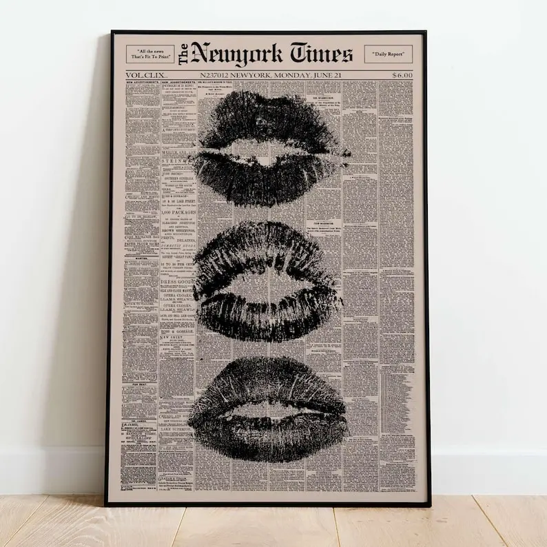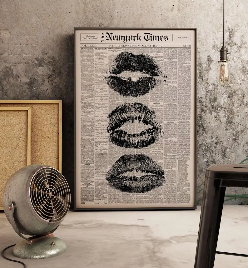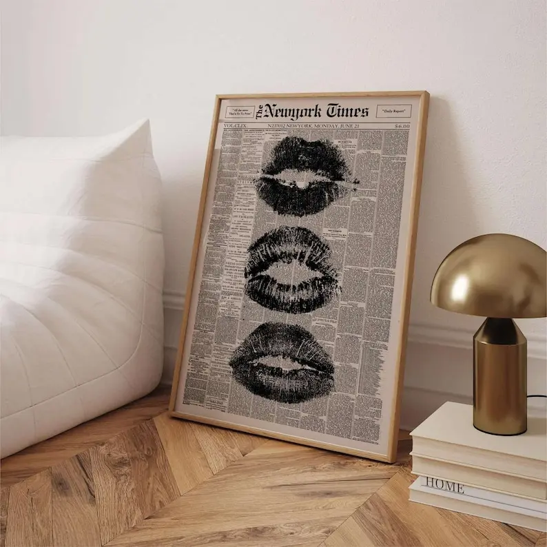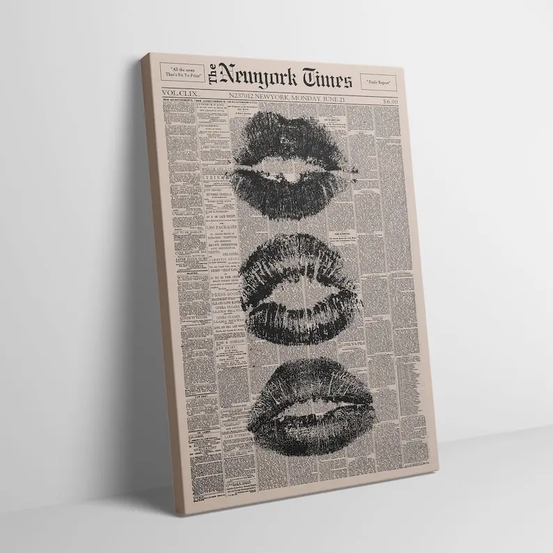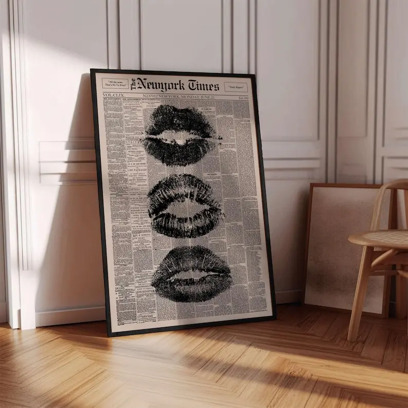 Trendy Black Kiss Lips Newspaper Unframe Poster, Vintage Black And White Wall Art, Retro Aesthetic Print, Canvas Wall Hanging, Girly Wall Decor