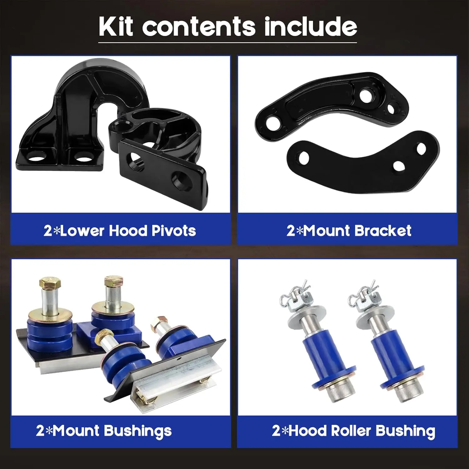 Direct replacement for factory kit: Matching factory lower hood pivot kit & hood hinge pivot bolt kit & hood hinge pivot bushing bracket kit.