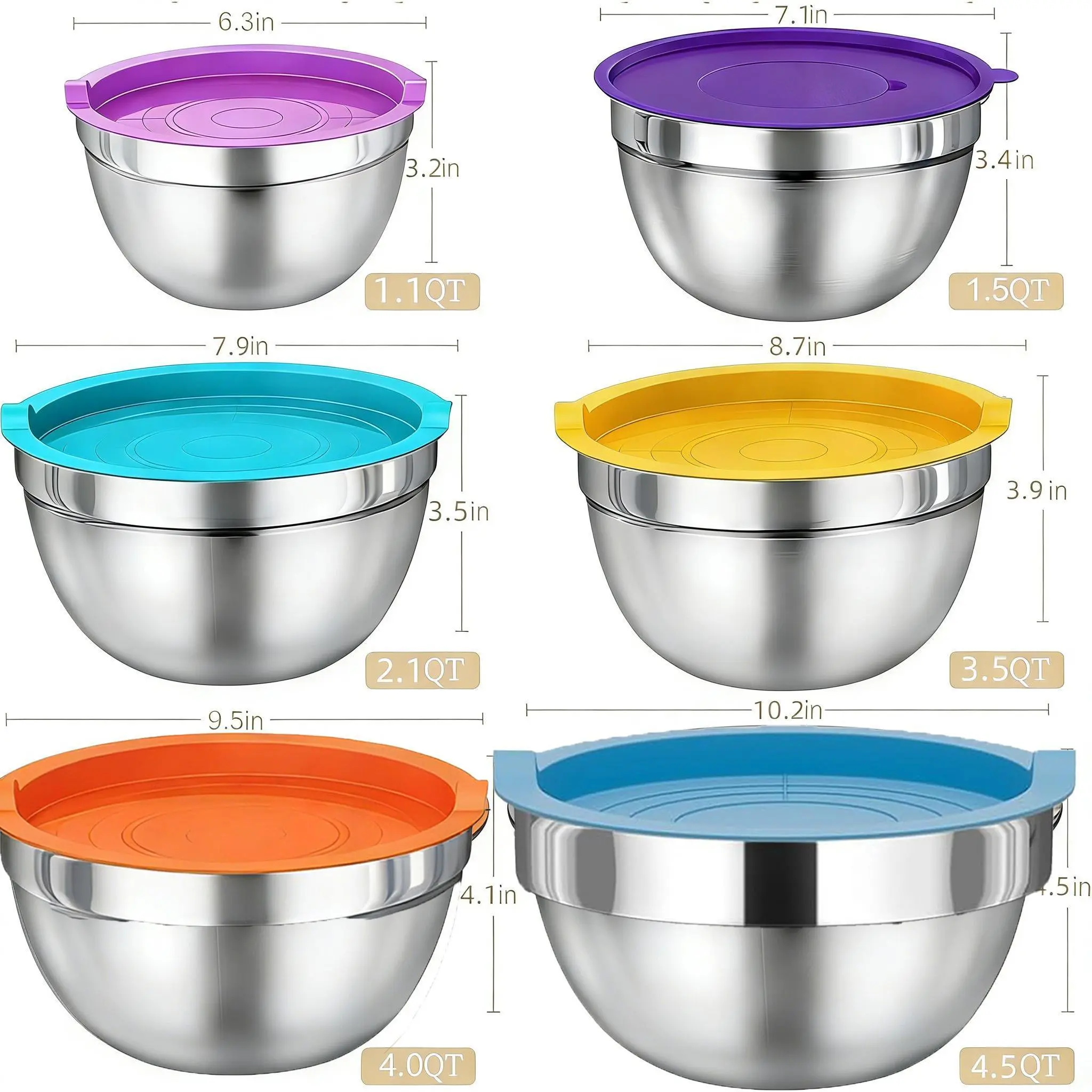 ·6 SIZES BOWLS & EXTRA KITCHEN TOOLS SET: The range of sizes from 7QT down to 1QT. Each bowl comes with a QT label to make it easier to choose the right size, Bowl sizes fit on standard-size refrigerator shelves and cabinets. Comes with a brush, spatula, whisk, measuring spoons