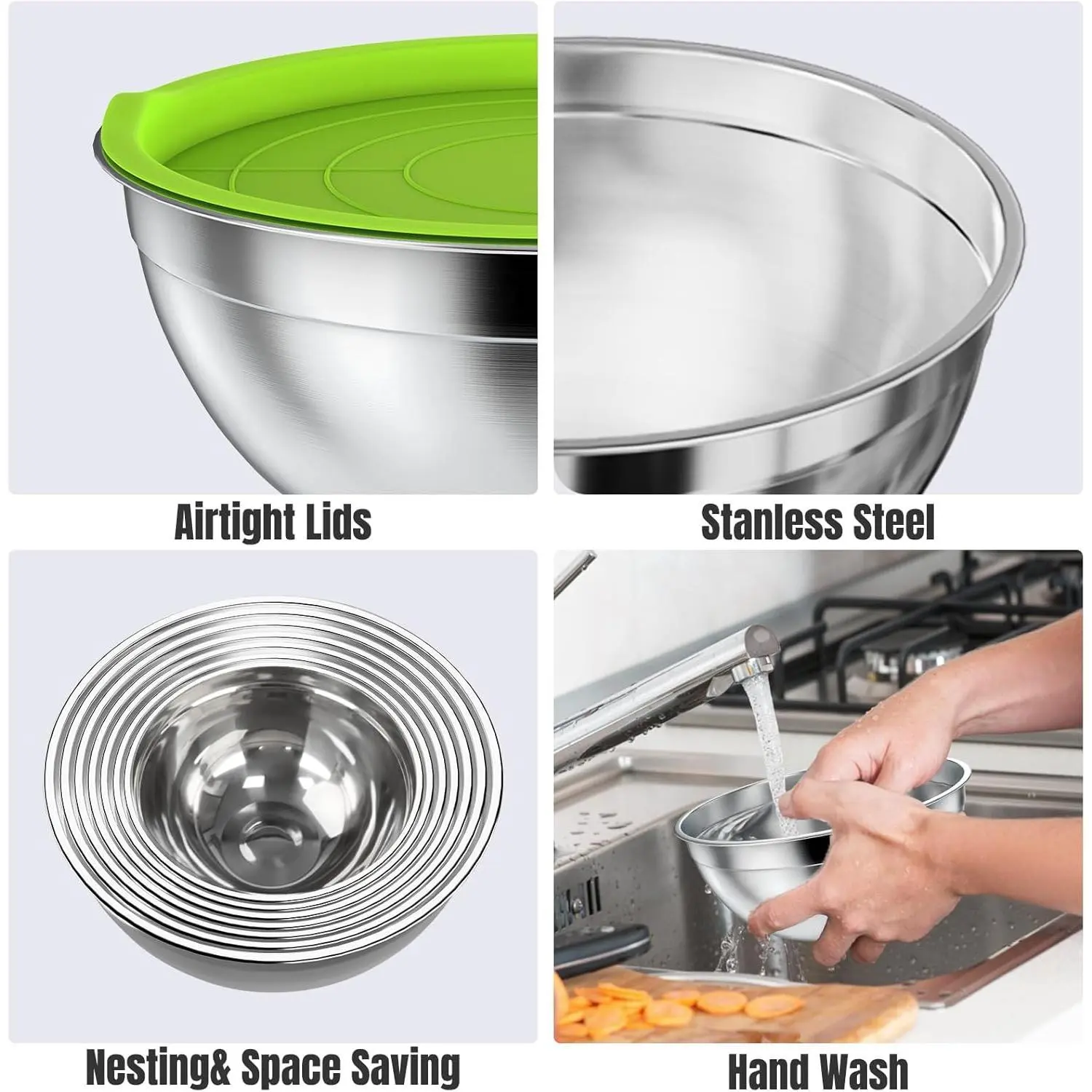 ·DURABLE STAINLESS STEEL: The stainless steel construction is durable. This bowl set is constructed of a mirror-finish interior and matte-finish exterior ensuring dent resistance and rustproof. Food-grade stainless steel will not corrode or produce spots after long time use, please attention that after each cleaning, it is necessary to dry the inside with a cloth to prevent the corrosion of the remaining water on the bowl