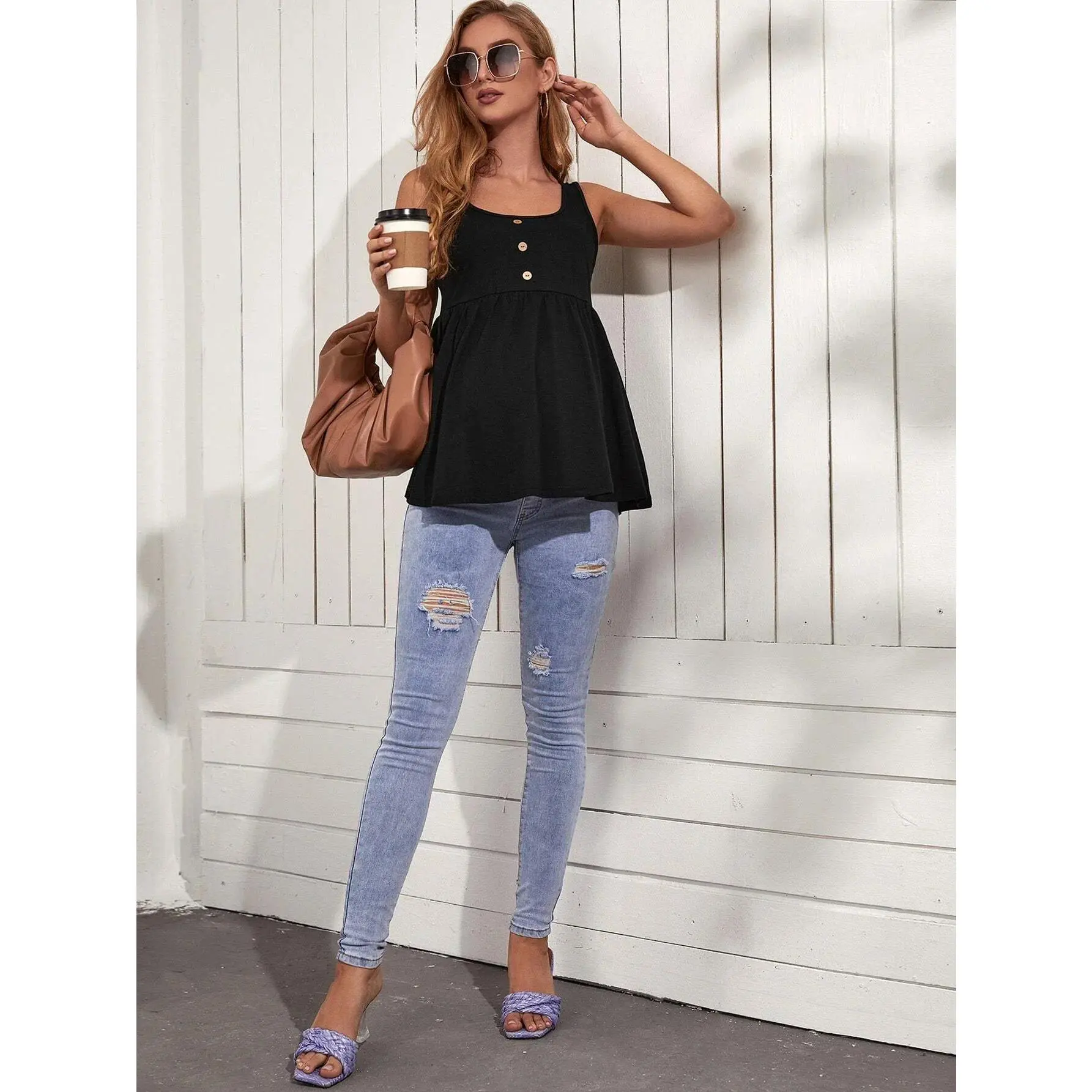 This maternity black camisole is ideal for casual summer wear. It's designed to be comfortable and stylish, making it a great choice for maternity clothing. The camisole features a simple yet elegant design, perfect for everyday wear. Pair it with jeans or leggings for a chic look.