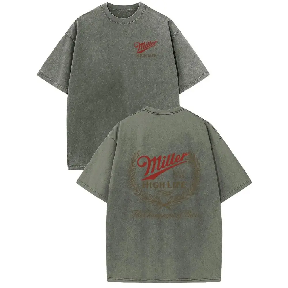 5. Holafish Acid Wash Miller High Life Champagne Beer Front And Back Graphic Print,DTG Process Unisex Loose-Fitting T-shirt, Washed Casual Top (100% Cotton, 280g), Smooth Fabric, Minimalist Style, Street Style, Classic T-shirt, Makes a Great Gift.