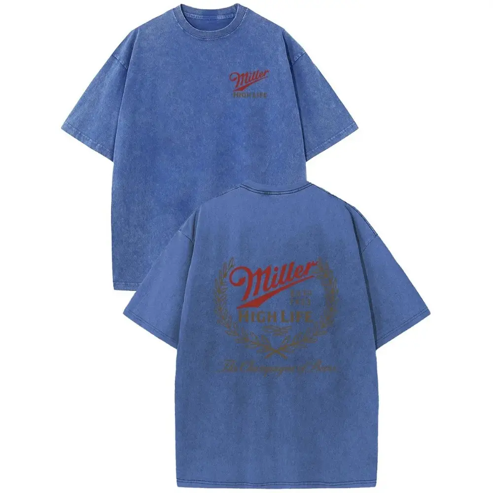Holafish Acid Wash Miller High Life Champagne Beer Front And Back Graphic Print,DTG Process Unisex Loose-Fitting T-shirt, Washed Casual Top (100% Cotton, 280g), Smooth Fabric, Minimalist Style, Street Style, Classic T-shirt, Makes a Great Gift.