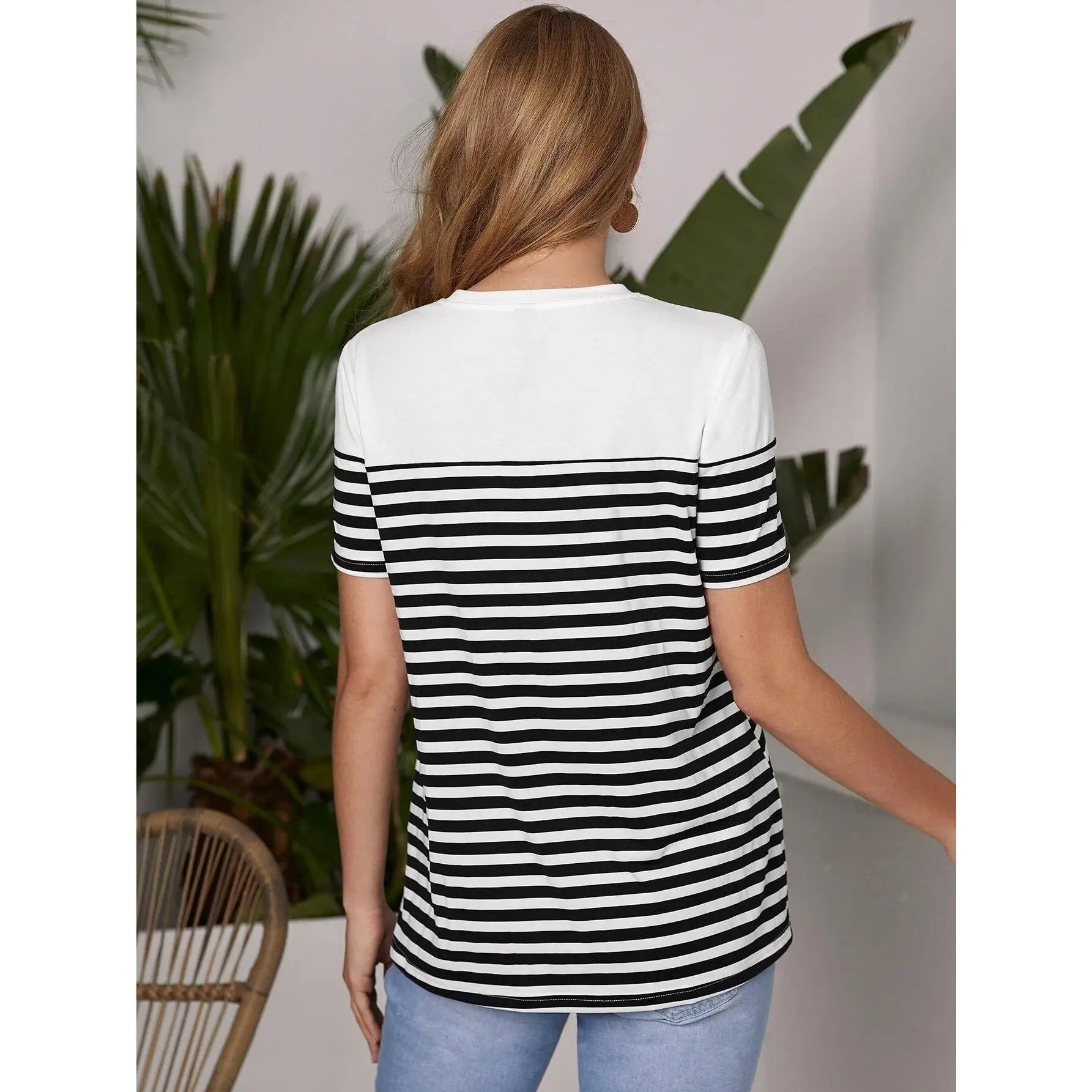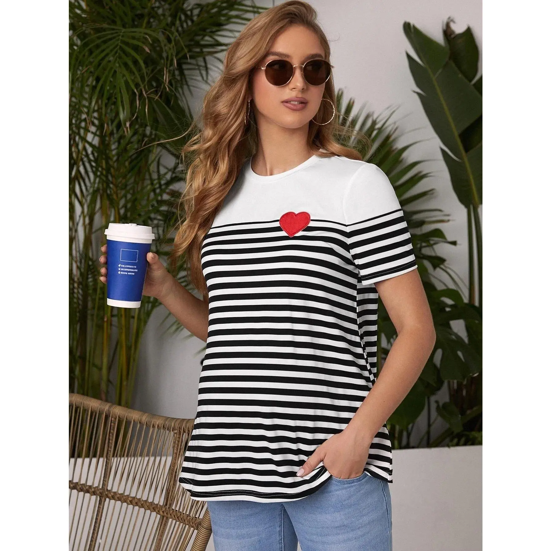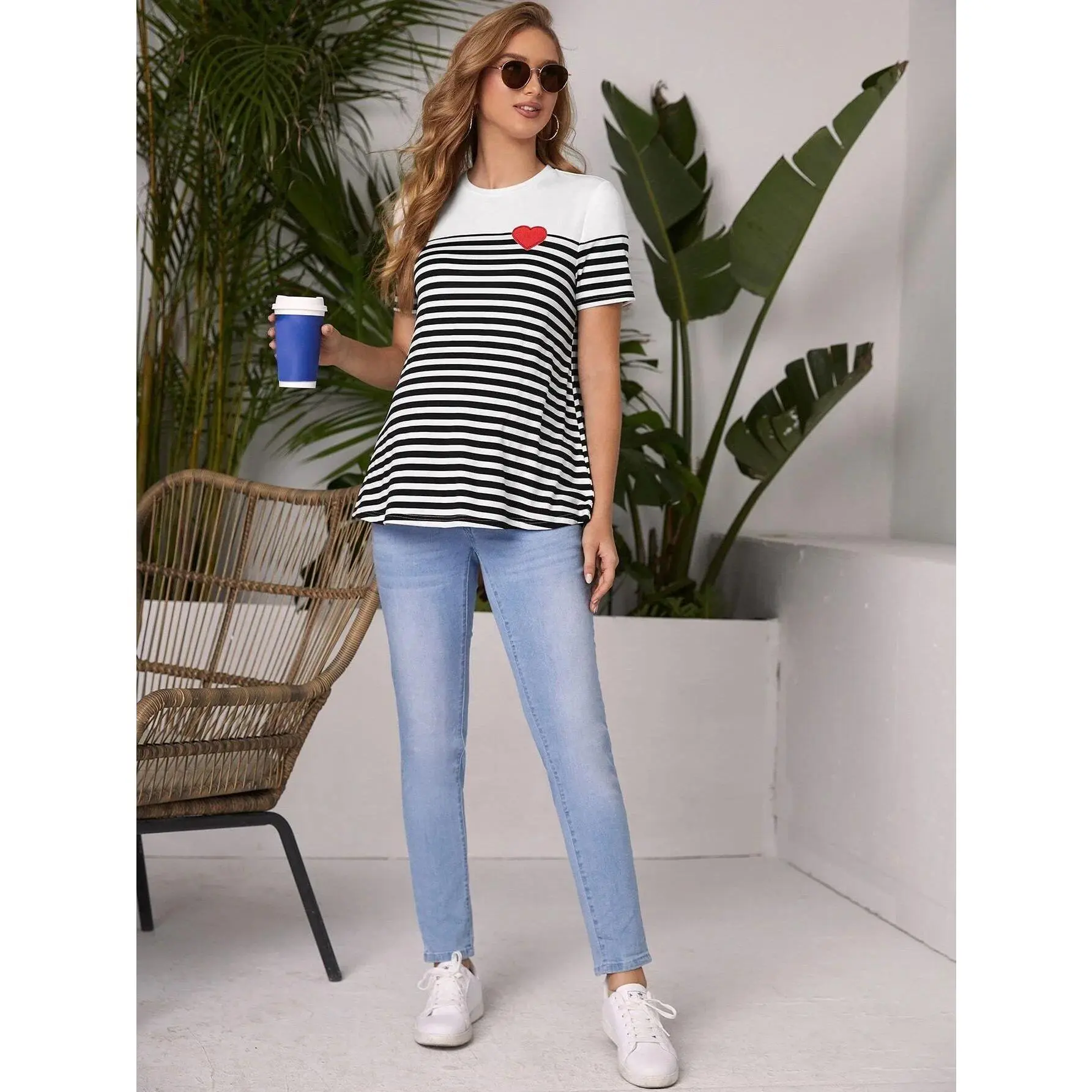 This maternity short-sleeve top is ideal for warm weather. The summer striped T-shirt design adds a stylish touch to your casual wardrobe. It's perfect for everyday wear, offering both comfort and style. The top features a heart detail, adding a playful element to the look. Pair it with jeans for a chic, relaxed outfit.
