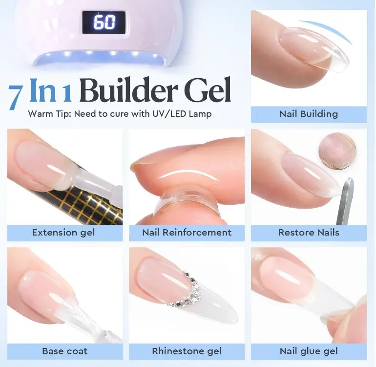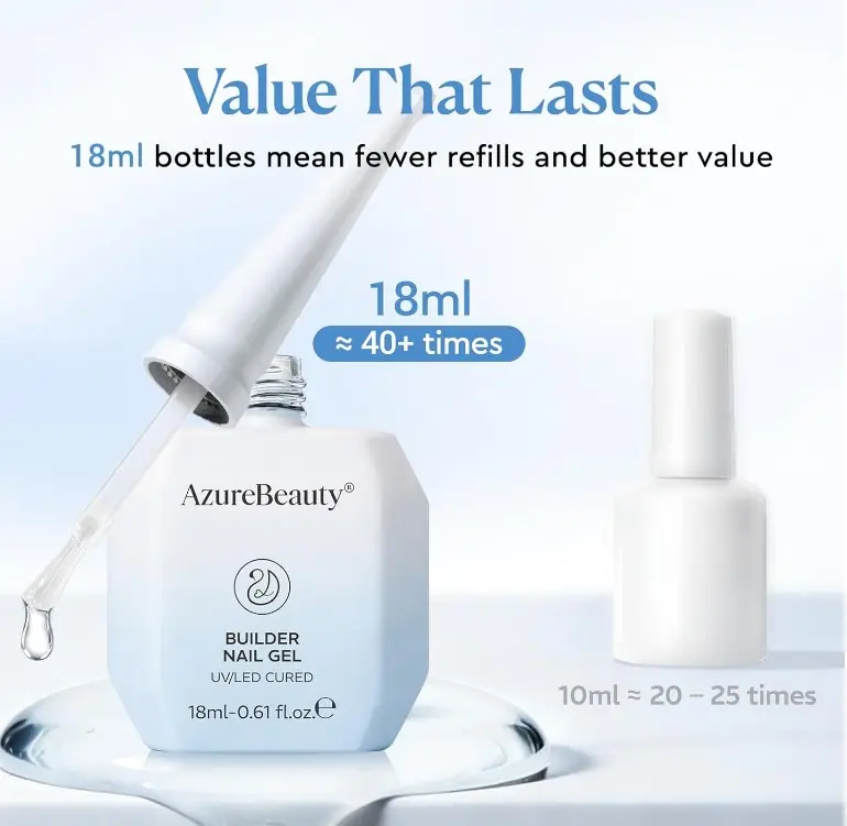 ·【18ML Professional Builder Nail Gel】7-in-1 multifunctional nail builder gel supports nail thickening, apex building, extension repair, false nail bonding and rhinestone decoration, also works as reliable rubber base gel. Extra large 18ml capacity offers high cost performance than regular nail gel, cutting daily manicure expense easily. Compatible with all UV/LED nail lamps for fast curing