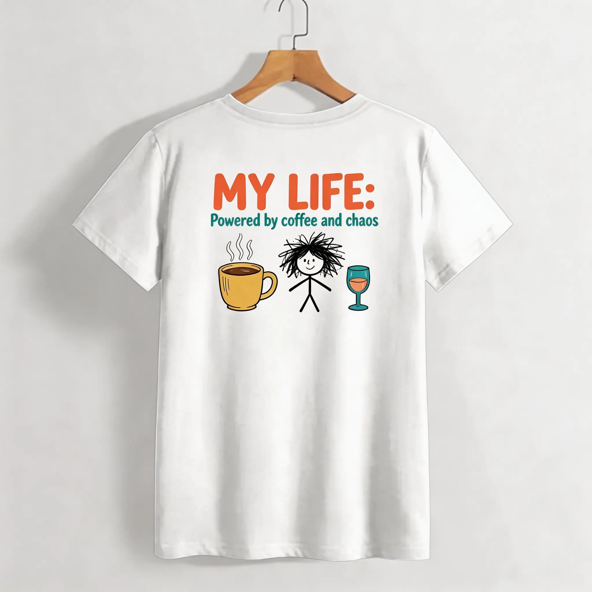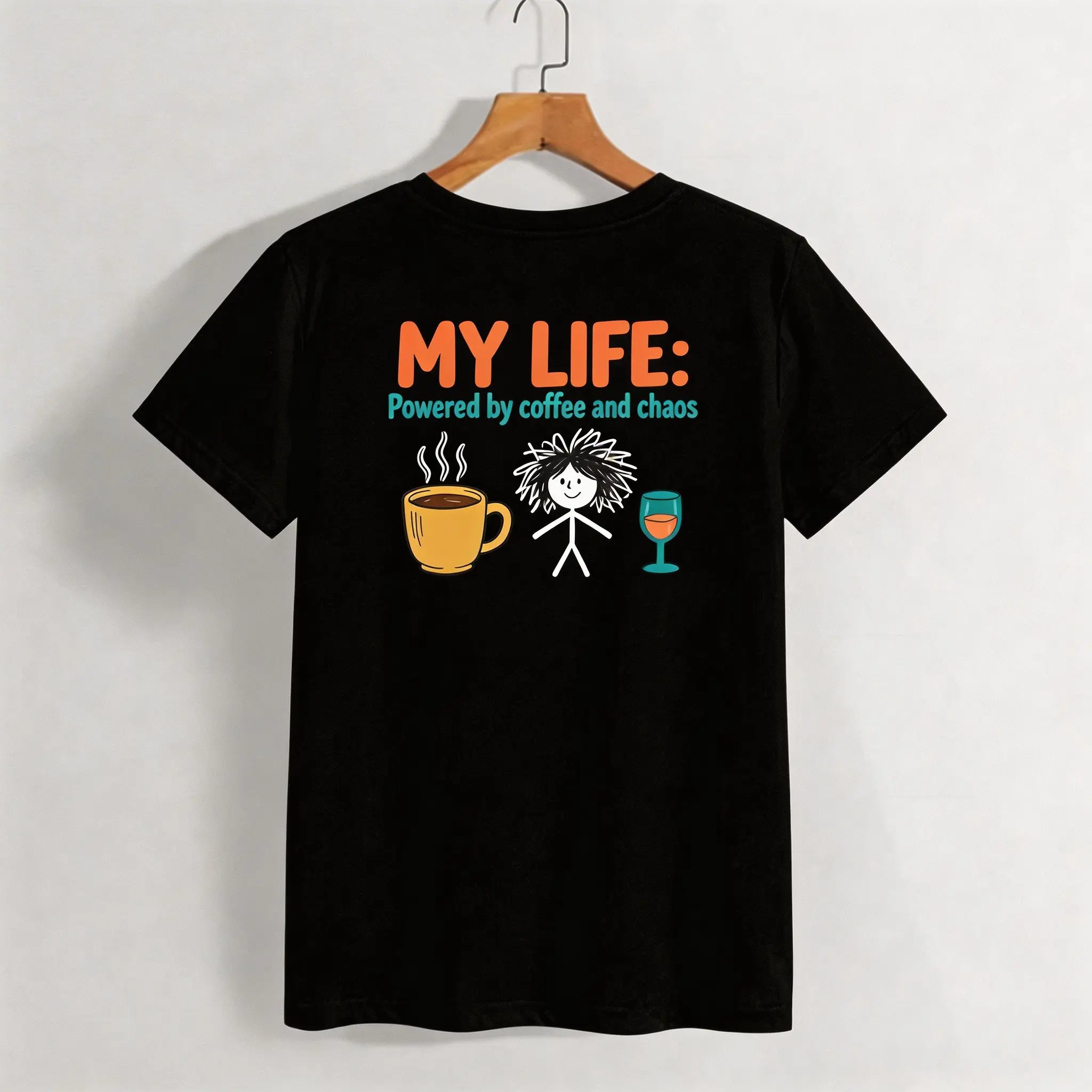 ✨ My Life Powered by Coffee and Chaos – This funny graphic tee is perfect for women who love a touch of humor in their wardrobe. The retro stick figure design adds a playful twist to your everyday look. Ideal for those who appreciate quirky, fun fashion.