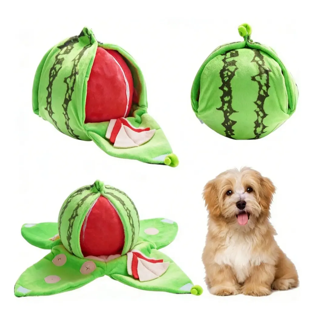 This adorable peeling watermelon ball pet plush toy brings double fun of play and snack time to your dogs and cats. Designed with a unique peelable outer shell, it includes 4 watermelon slices and 1 outer rind snack mat, making it an interactive and engaging toy for your furry friends.