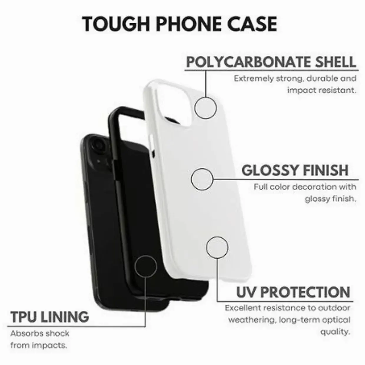 With its sleek glossy premium finish, the Tough Phone Case is also UV protected, preventing discoloration and maintaining its stylish look for a long time.
