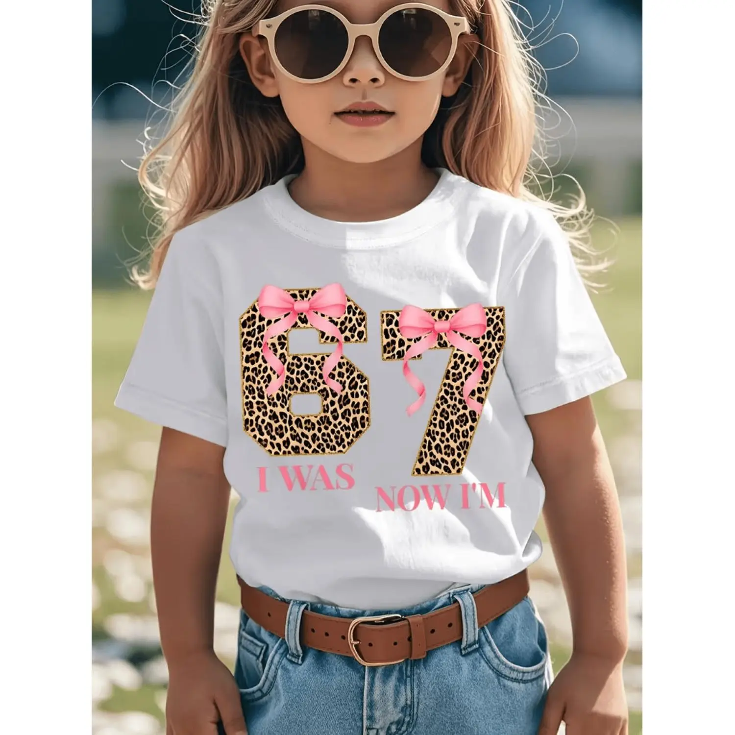 Girl's 7th & 6th Birthday Outfit – "I'm 6, Now I'm 7" Number 67 Meme Pink Bow Leopard Print T-Shirt | Soft Breathable Kids Tee for 7-Year-Old Girls, Birthday Party or Casual Attire | Cute Round Neck Short Sleeve Top