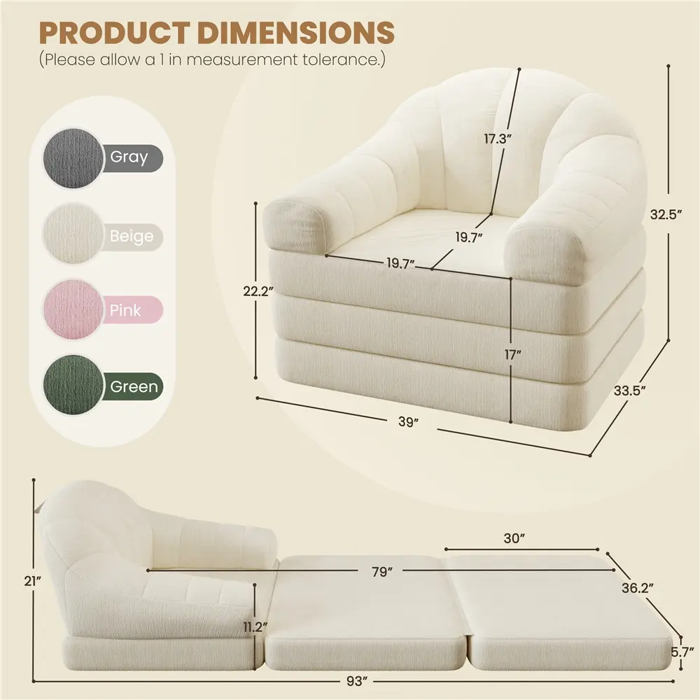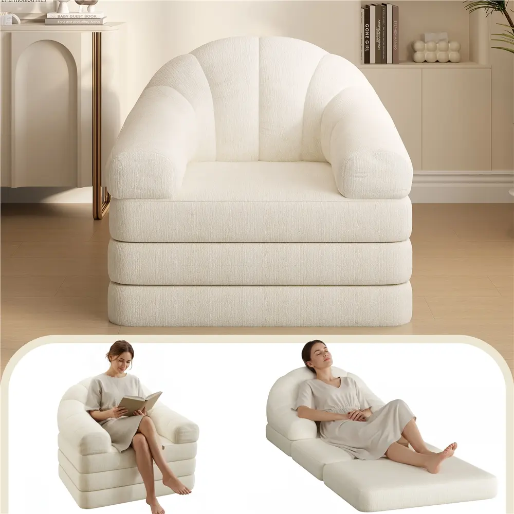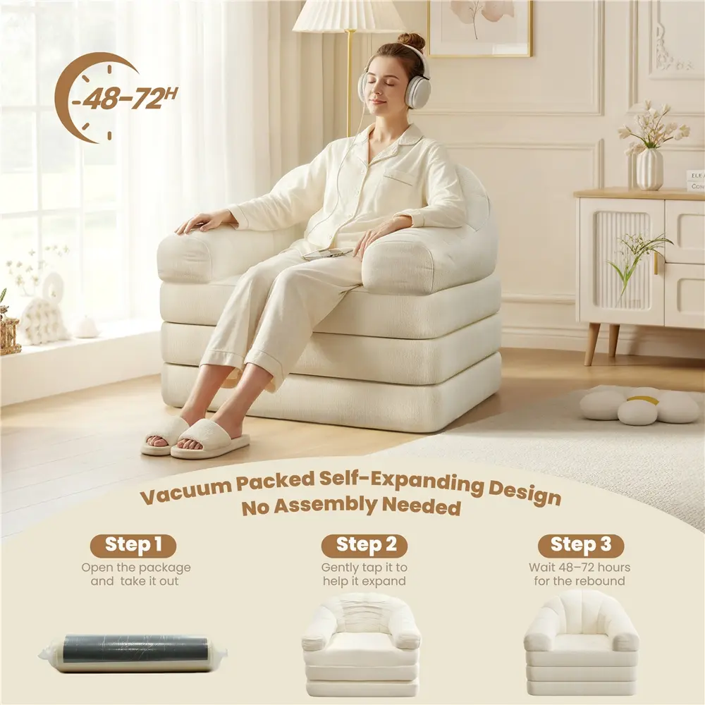 Designed to make everyday living more comfortable, this foldable chair bed blends softness, flexibility, and space-saving design into one inviting piece. Wrapped in warm chenille and filled with thick high-resilience foam, it provides cloud-like support whether seated upright or fully extended. Transform it effortlessly from a cozy bean bag chair into a sleeper for guests, ideal for living rooms, bedrooms, dorms, or compact apartments. Wide U-shaped arms, anti-slip pads, and a stable base enhance relaxation and security, while an integrated handle simplifies movement. With no assembly required, just wait for it to expand into a versatile comfort solution—ready for gaming, reading, lounging, or restful sleep whenever you need it.