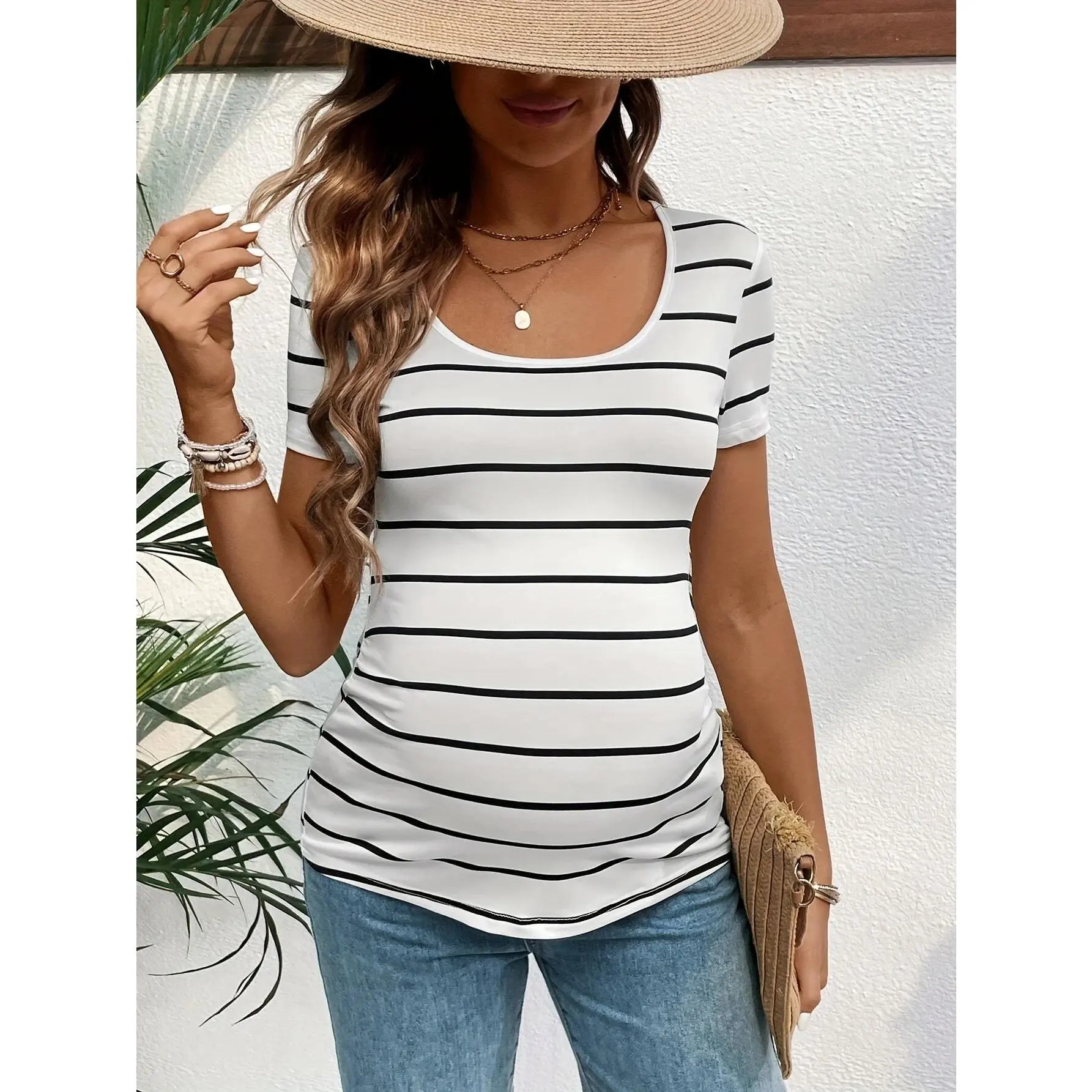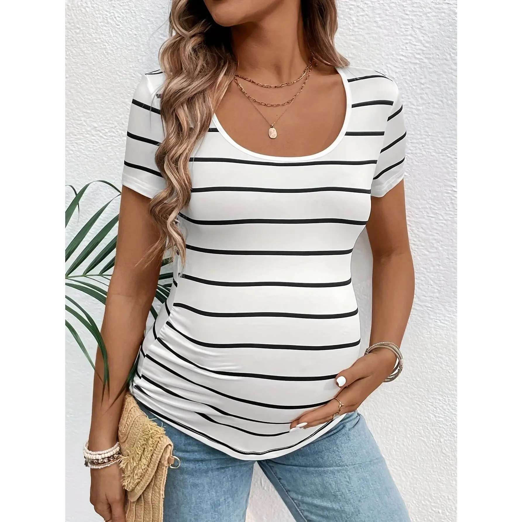 This casual maternity top is ideal for warm weather. The white base with black stripes offers a classic, versatile look. Perfect for everyday wear, it combines comfort with style. Pair it with jeans or shorts for a relaxed yet chic outfit. Ideal for expecting mothers who want to stay fashionable and comfortable.