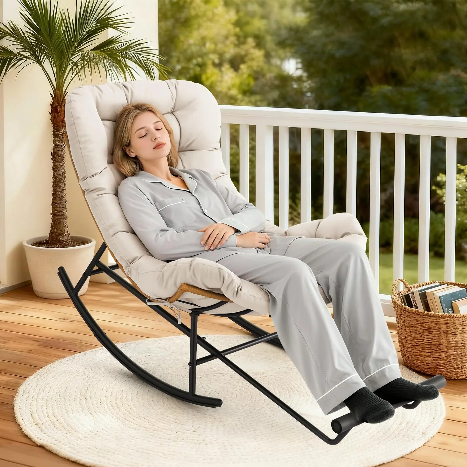 ✨ Kick back and unwind in our oversized papasan chair. It features a built-in metal foot rest with sponge pads, supporting your entire body. Perfect for reading, napping, or enjoying a gentle sway on your patio or in your living room. This design offers full-body relaxation, making it a must-have for any space.