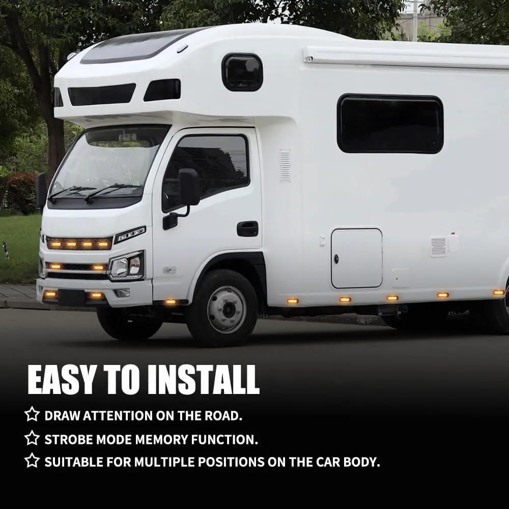·Easy installation: Led storbe lights for trucks equipped with installation gaskets and screws, it can be flexibly installed at multiple positions such as vehicle grilles, front and rear bumpers, side markings, etc.It has strong adaptability and the installation process is simple and quick.Wires Connection: Black for Negative (-), Red for Positive (+), Yellow (pattern change:Yellow wire touches black for less than 1s to the next mode.)and White-(Synchronization), connect white wire of all heads together for synchronization.(up to 2-8 lights can be synchronized) .And has a mode memory function to remember your last selected mode.
