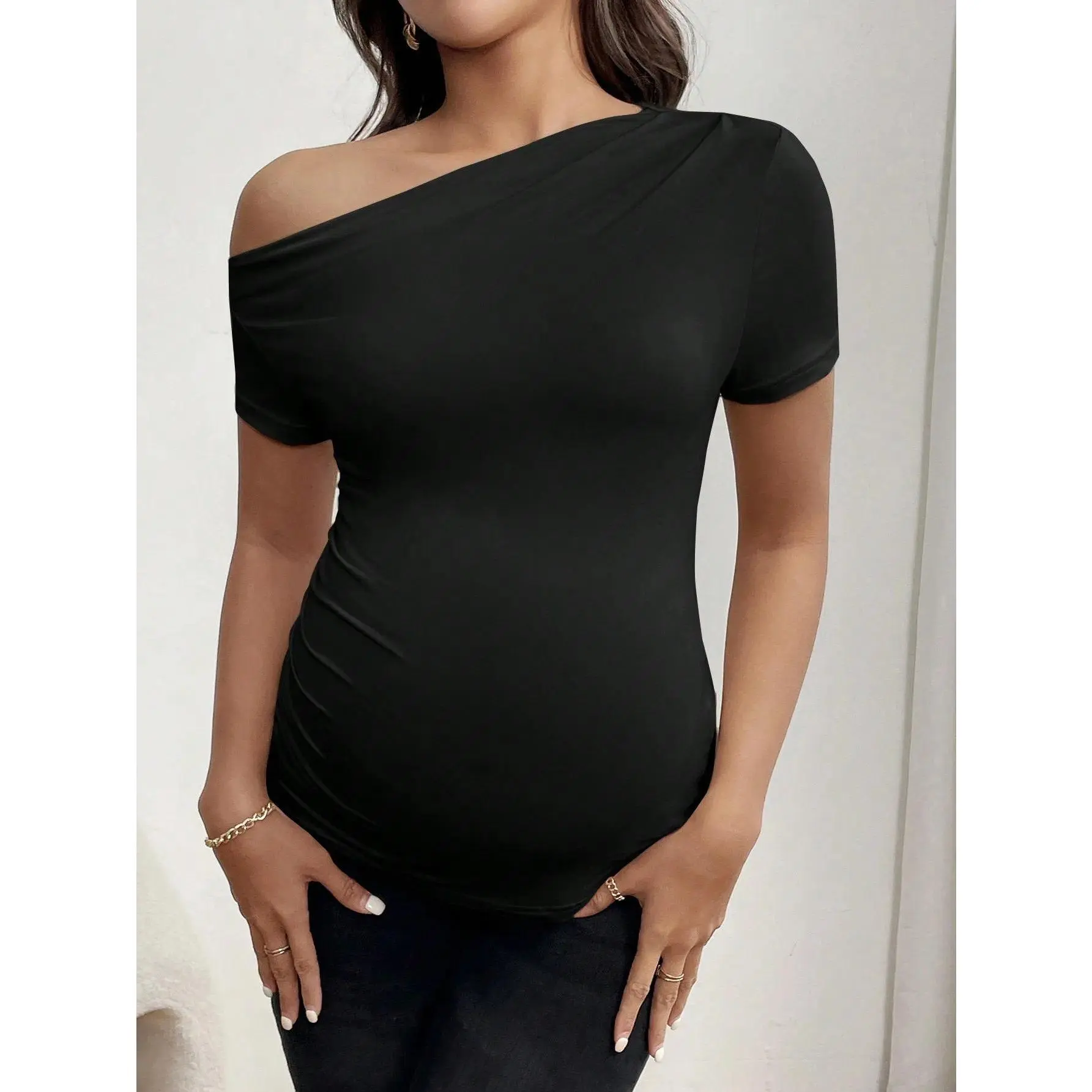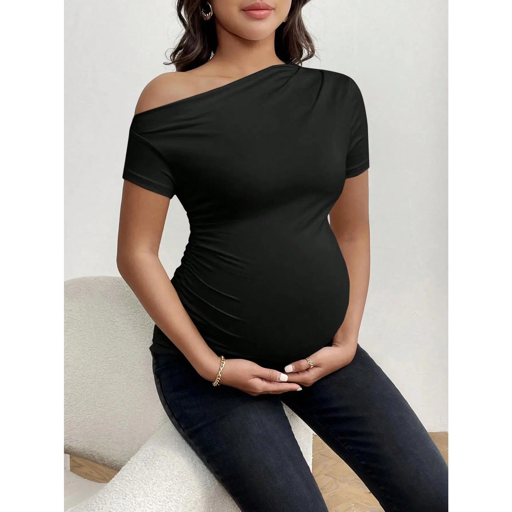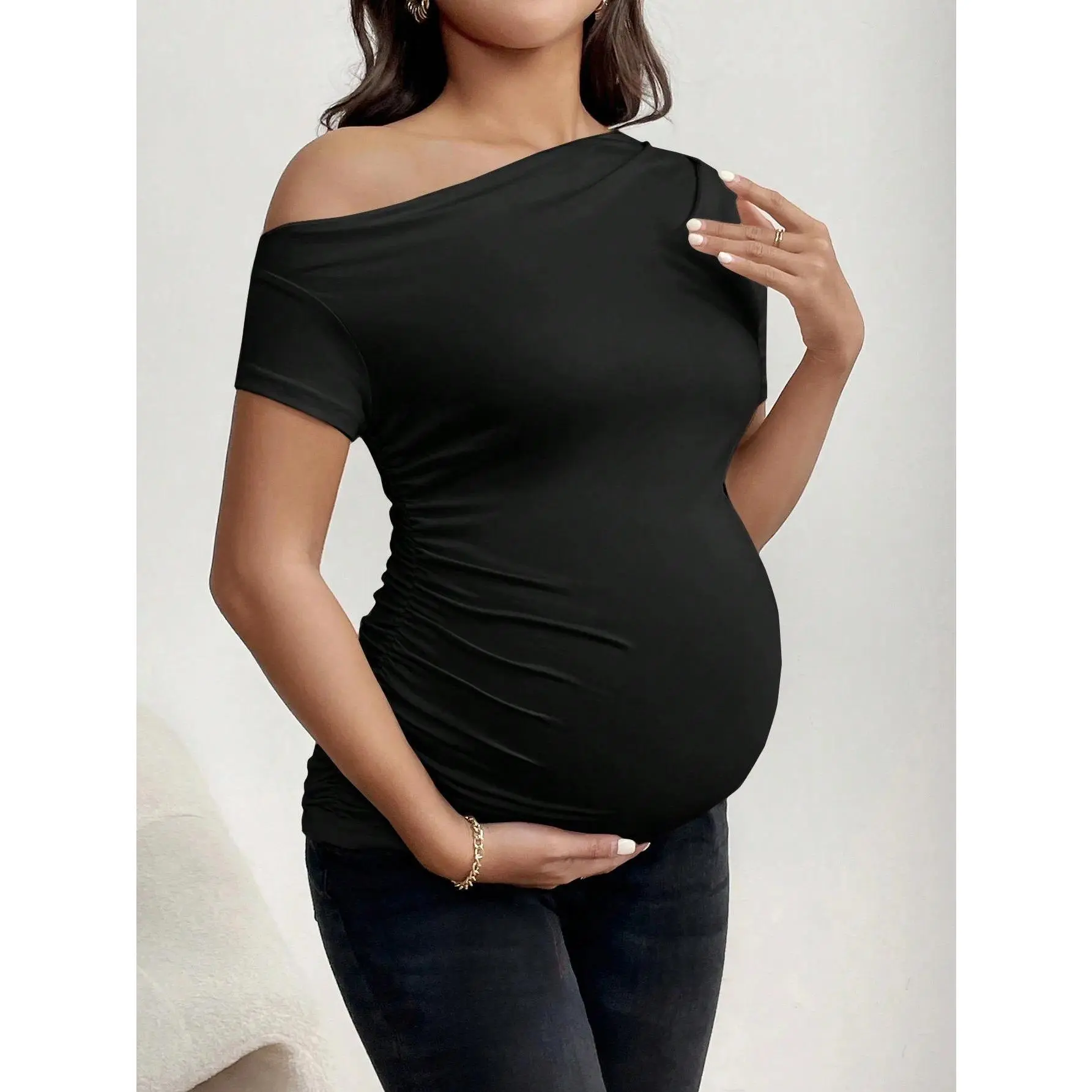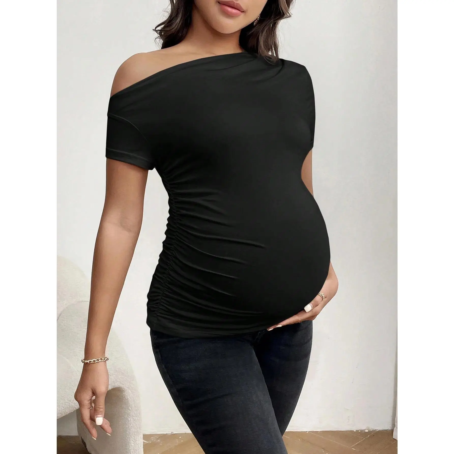 Maternity short-sleeve casual sports black T-shirt for summer, off-the-shoulder shoulder-baring maternity blouse