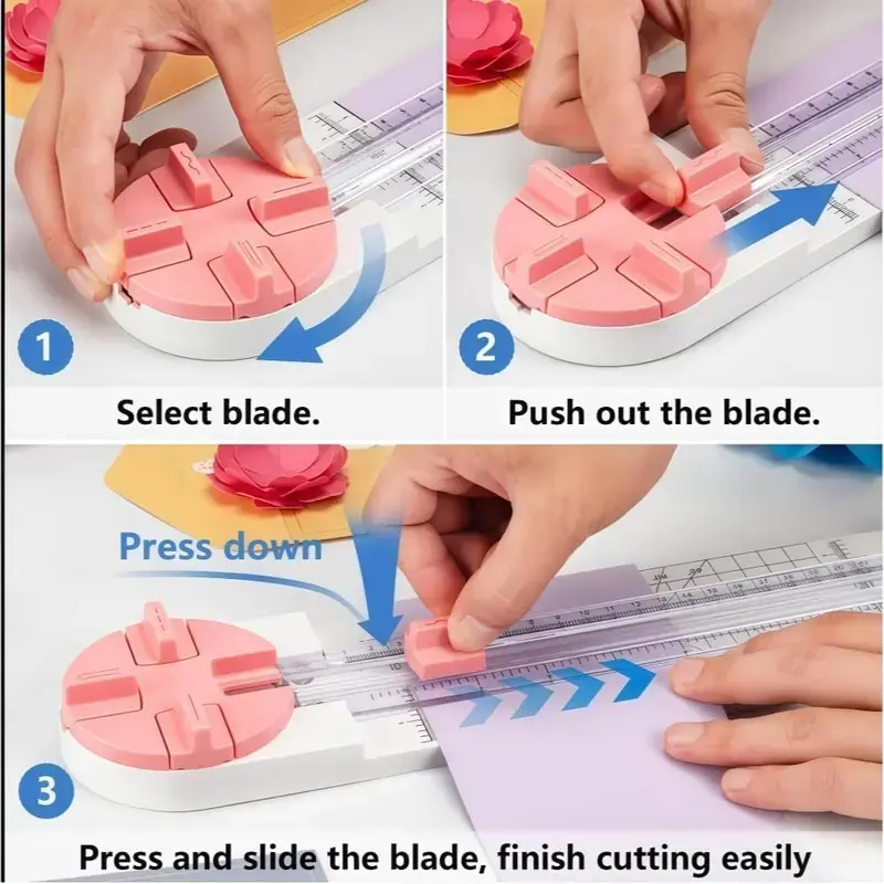 ·【Efficient Cutting】With a maximum cutting width of 9 inches, this paper cutter effortlessly trims up to 5 sheets (80g/m2) at once. Cut a little lesser prolongs blades' service life. Different blades has different cutting abilities-- Blade of straight line: 5 sheets; blade of wavy line: 3 sheets; blade of dotted line: 3 sheets; creasing blade: 3 sheets.Blade replacement is easy and ensures optimal cutting performance. Perfect for small volume cutting tasks.