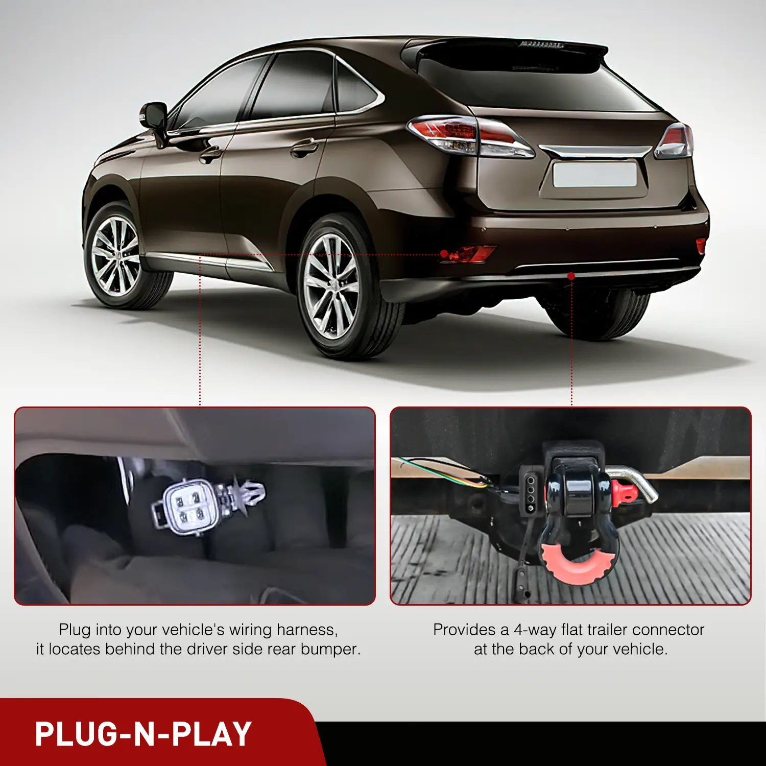 With Standard 4-way trailer plug, simple plug-and-play design, provide a 4-Way flat for plugging in and towing a trailer.