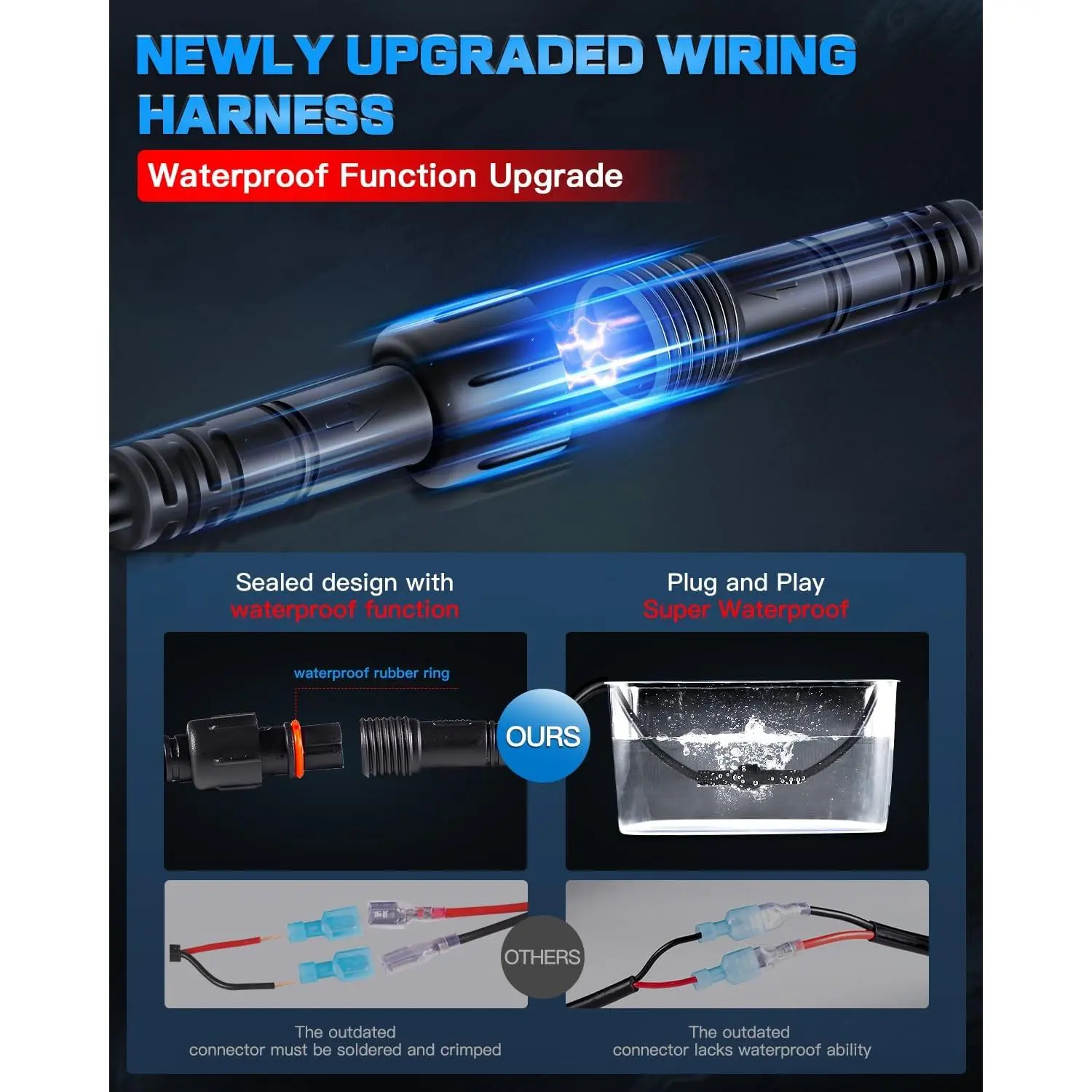 [Outstanding Waterproof Performance]Silicone Ring Sealed PC Lamp and Silicone Side Gasket Sealed Body,IP68 Waterproof & Dustproof.The Off Road Wiring Harness With Scres Down Cap Connectors for Waterproof.All Full Sealed Design to Allow the 20in LED Light and 4 Inch LED Cube Pods Works in Any Harsh Weather and Conditions:Rain, Fog,Snow,Mud,Wading,Even Frozen.Extend Over 50,000H Lifespan.