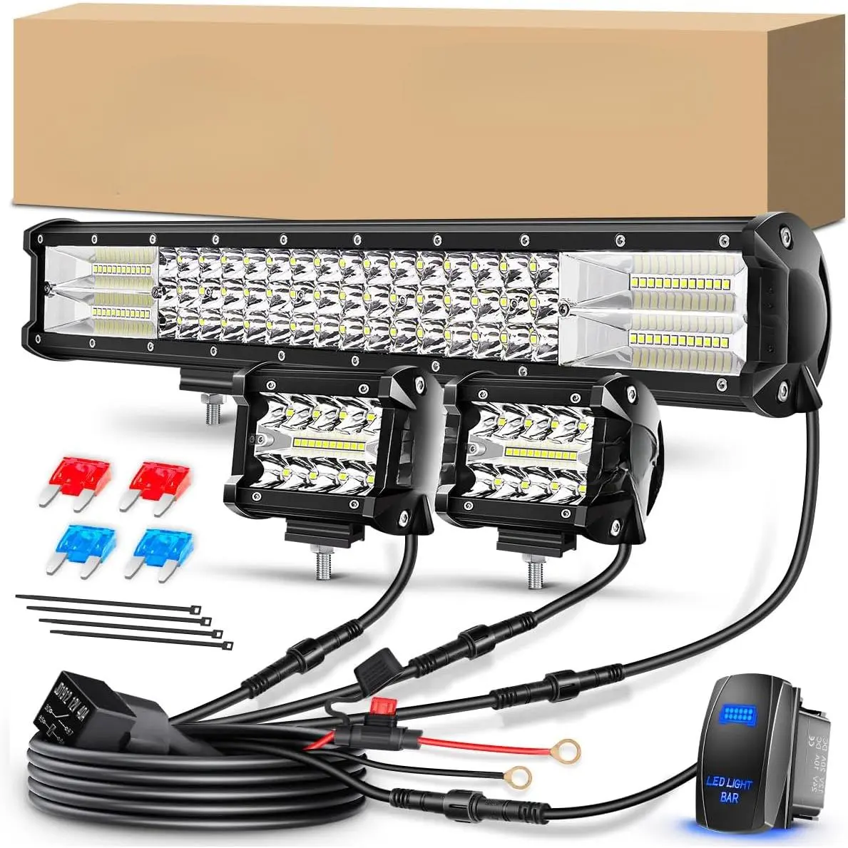 [Customer Support]We offer 24 hours online heartfelt service.you have any questions about our 20in led light, please to contact us without hesitate and we will do our best to serve you!The package including: 1PCS 20 inch Led Light & 2PCS 4 inch Pod Lights & 3 11ft Wiring Harness & 4PCS Adjustable Mounting Brackets & 2PCS 15A & 2PCS 10A spare fuses & necessary mounting hardware.