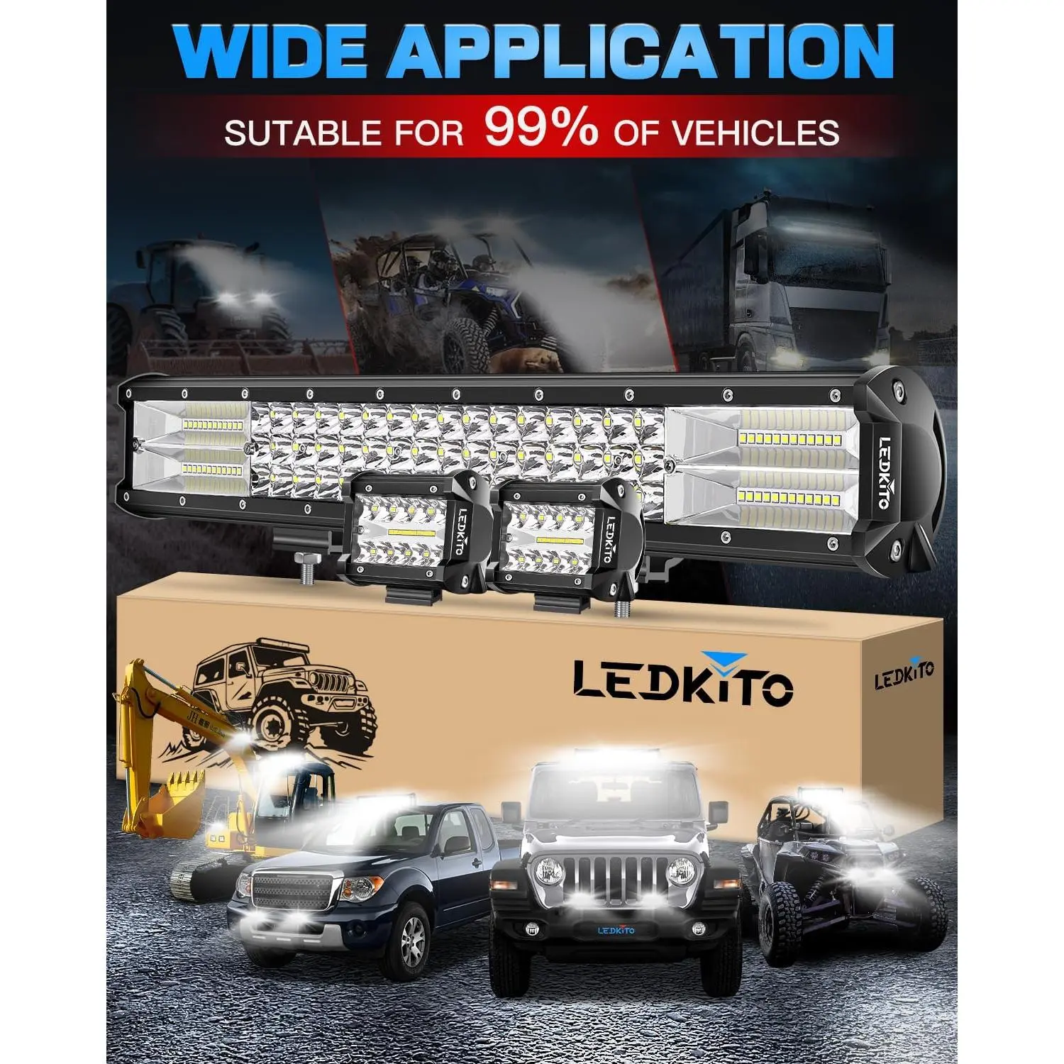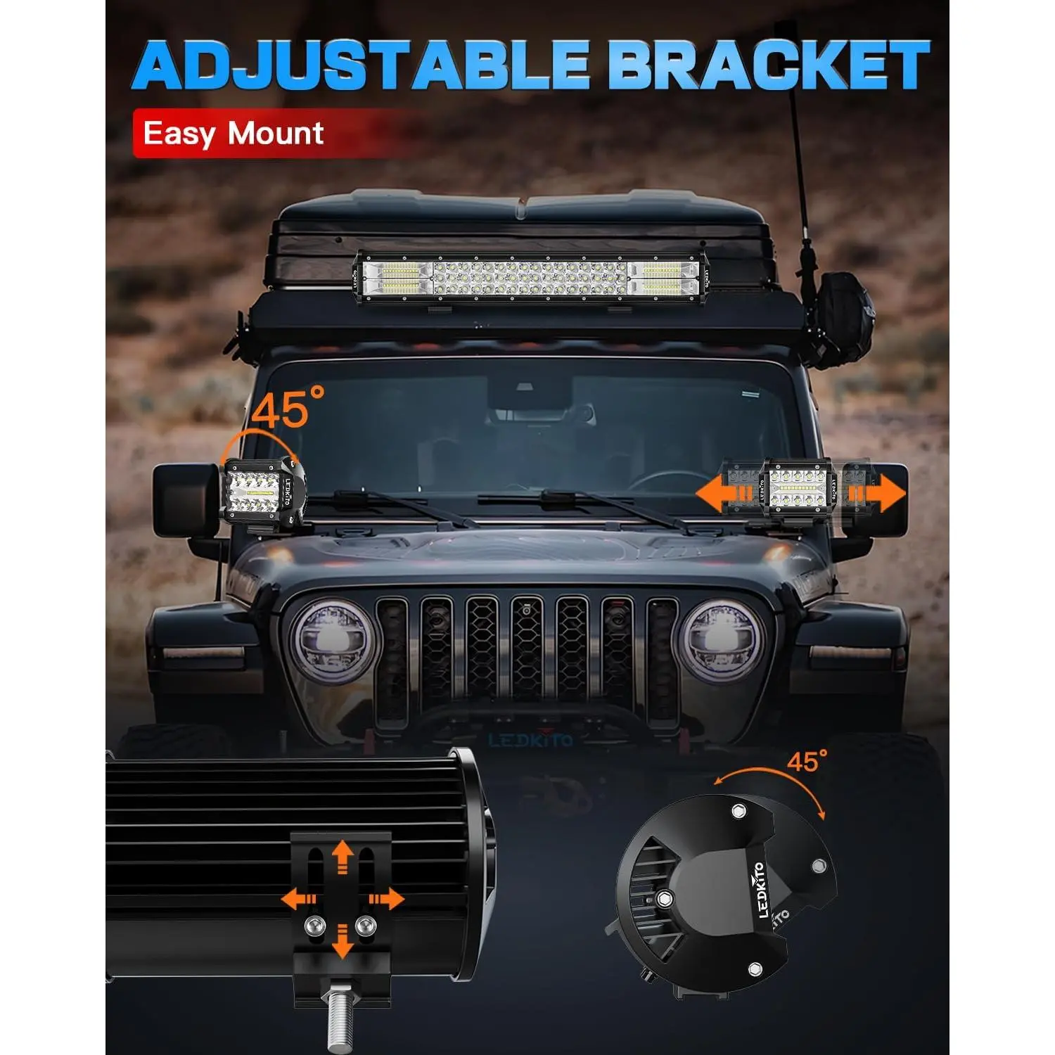 [Installation Instruction]20inch Light come with adjustable bracket,can be freely adjusted mounting angle up to 45º with the Up & down.The mounting brackets can be adjusted to meet your needs.Widely used for Je-eps, Truck, Off-Road, Cars, ATV, UTV, Tractor Motorcycles,led off road lights.Specially vehicle:Heavy Duty,Heavy Machine, Excavator, Road Roller, Bulldozer, Lawnmower, Snow Blower, Trailer, Forklift, etc