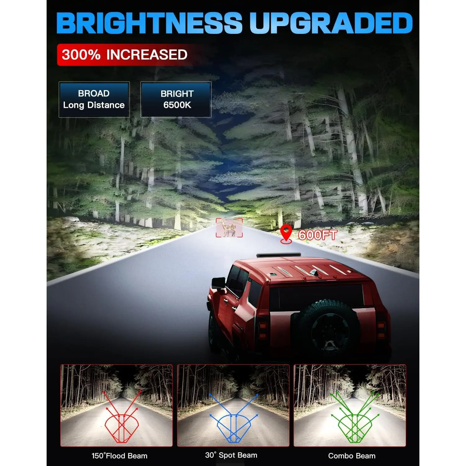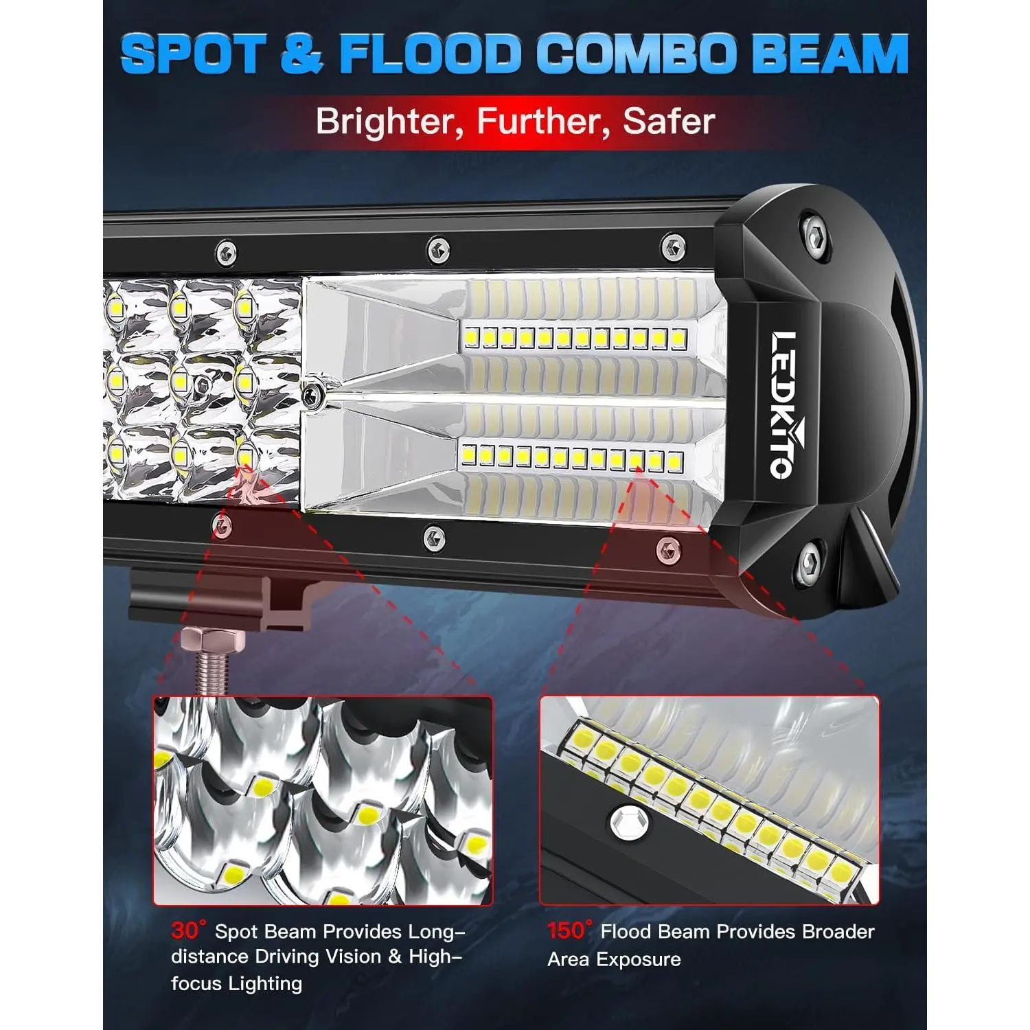 [Bright Combo Beam LED Light and Pod Lights Kit]20 Inch LED Light and 2PCS 4 Inch LED Pods Kit Total Adopt 180PCS High Bright LED for Spot/Flood/Combo Lighting.Emit 6000k Bright White Light.The 30°Spot Beam Provide High-focus & Long-distance Illumination or for Specific Areas Search.While The 150° Flood Beam Provides Broader Area Exposure for Wider.The Spot & Flood Combo That Emits Brighter,Broader & Farther Beam,Improve Overall Visibility.for Off Road Driving!