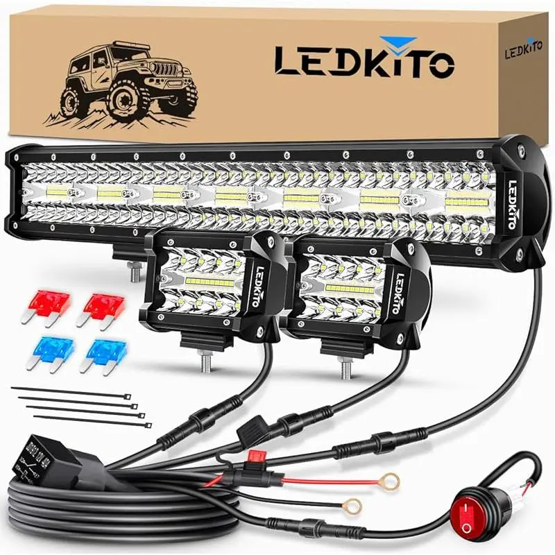 [Excellent Harness Kit]20 Inch LED Light and 2PCS 4 Inch LED Pods Off Road Lights Kit With Switch 3 Off-road Wiring Harness Kit[With Screws Down Caps for Waterproof,Quickly Connection.It wrapped by a thermoplastic jacket that insulates up to 105℃.