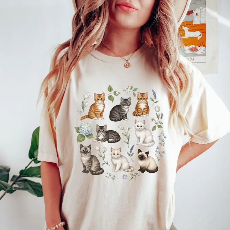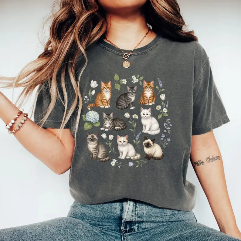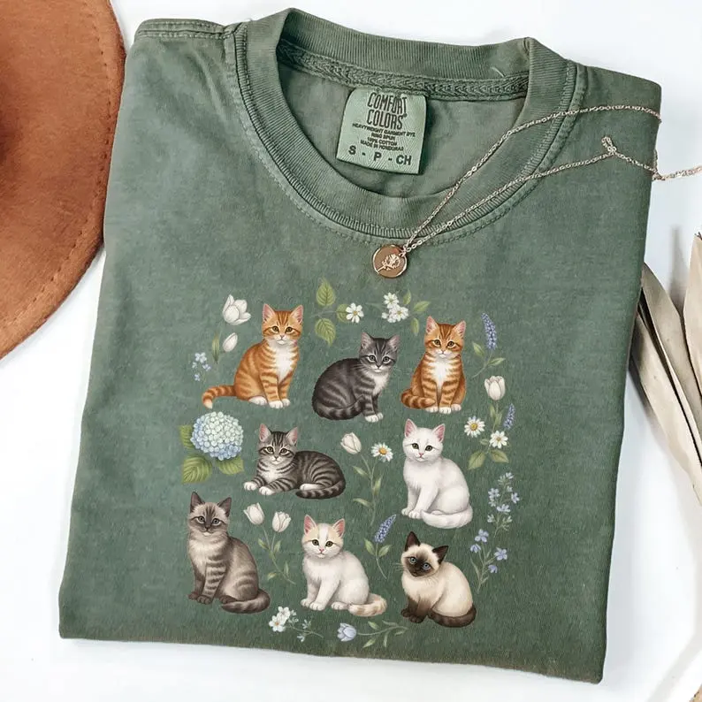 Comfort Colors Cottagecore Cat T-Shirt, Vintage Cat T-Shirt, Cottagecore Clothes, Cat Lover Gift, Kittens and Pressed Flower, Goblincore Tee
