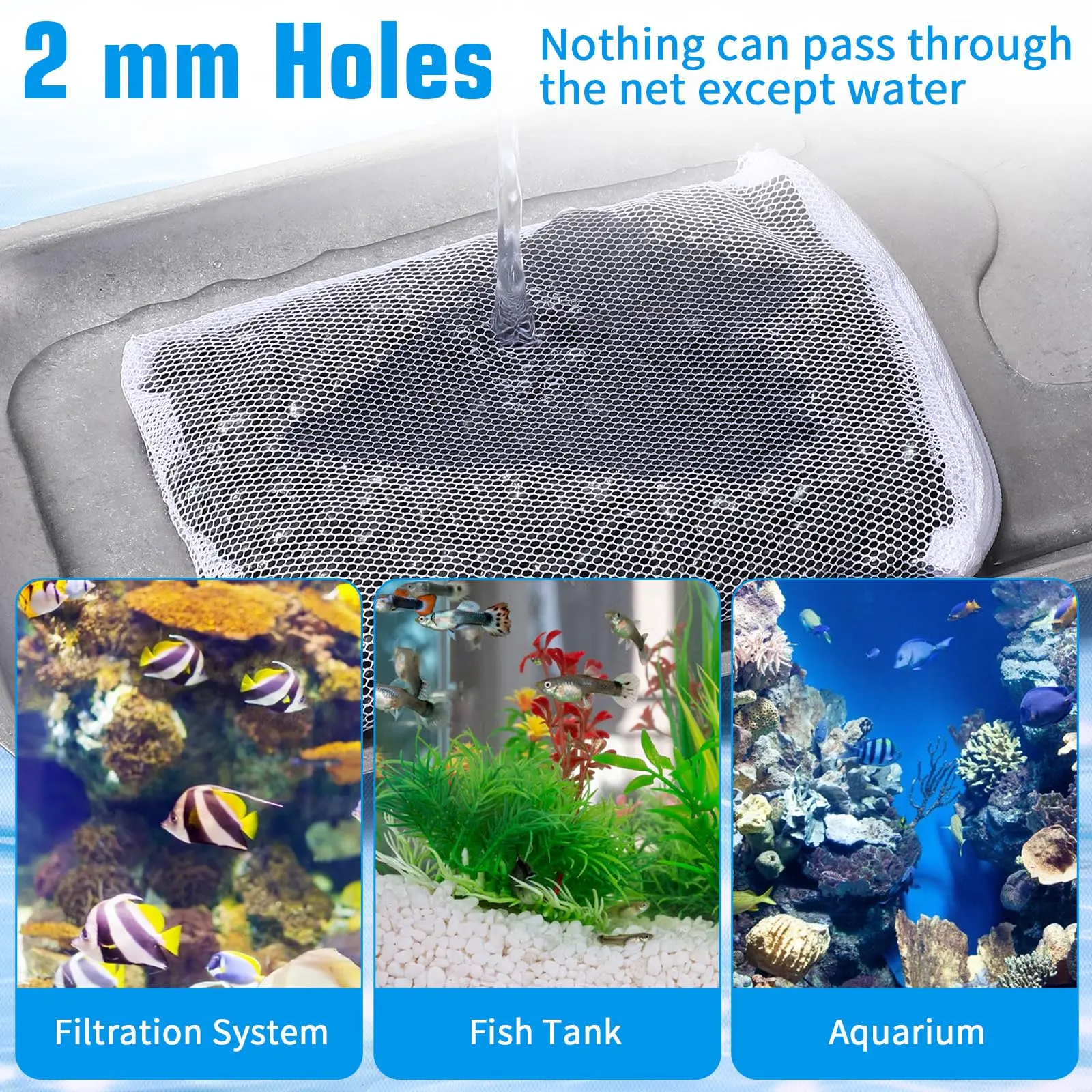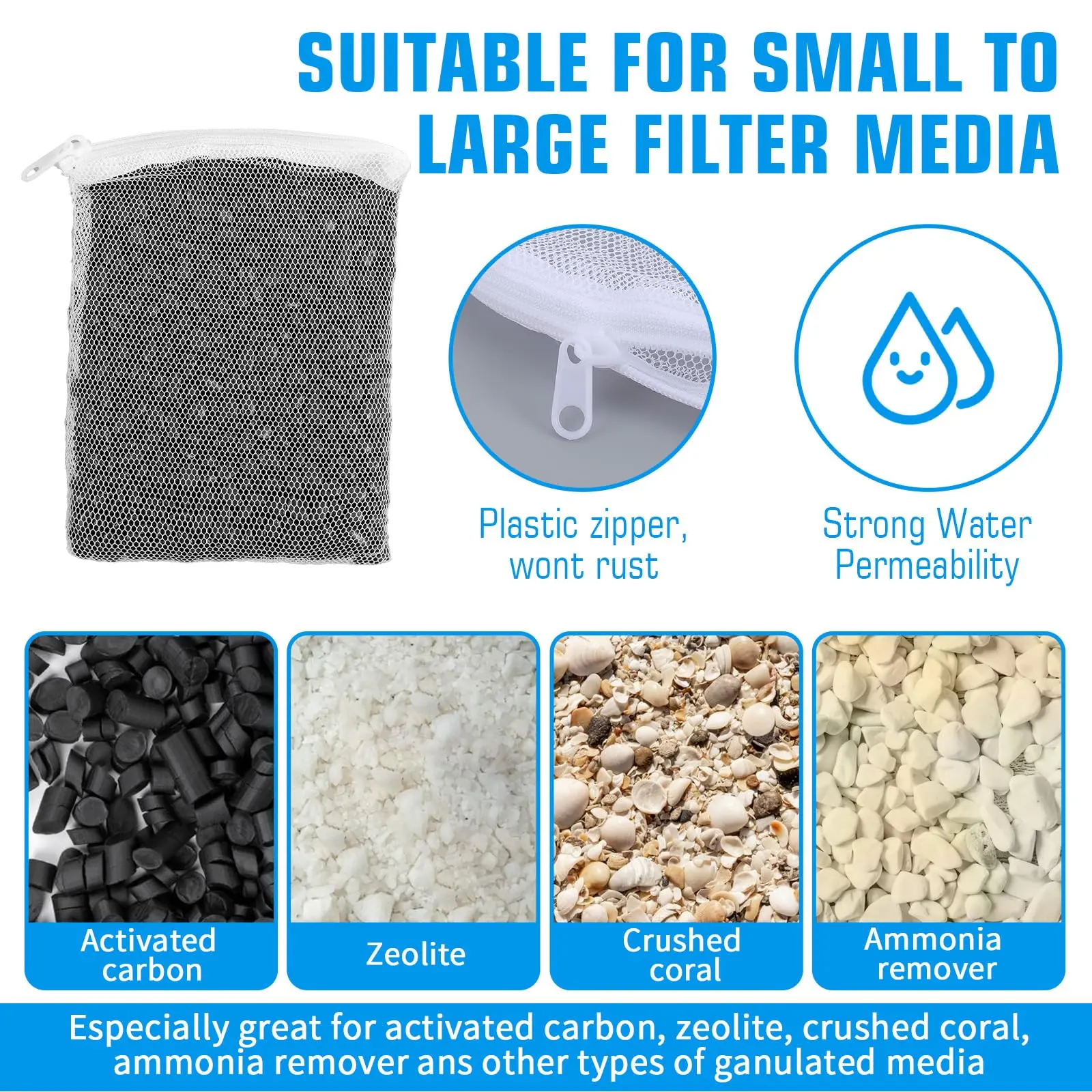 ·Optimal Mesh Hole Diameter: Featuring a mesh hole diameter of approximately 2mm, these bags are suitable for accommodating various filtration media types, including respiratory biological rings, activated carbon, and ceramic rings. Note: Not suitable for finer particles.