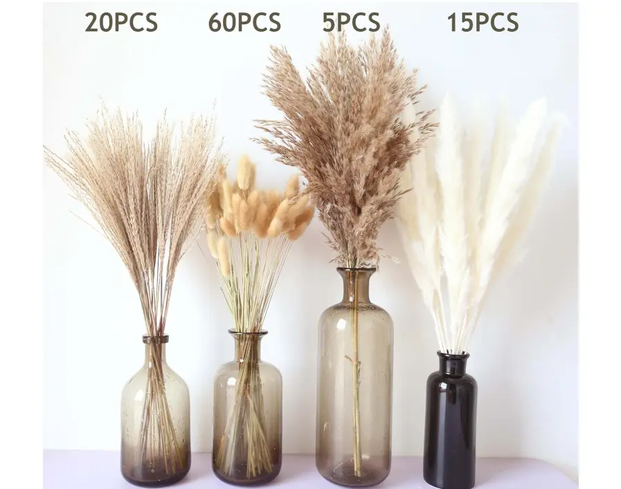 ·Items in the package: contain 15PCS white pampas grass + 5PCS fluffy large pampas grass + 20PCS reed pampas grass + 60PCS natural bunny tails grass, Length 15-17".